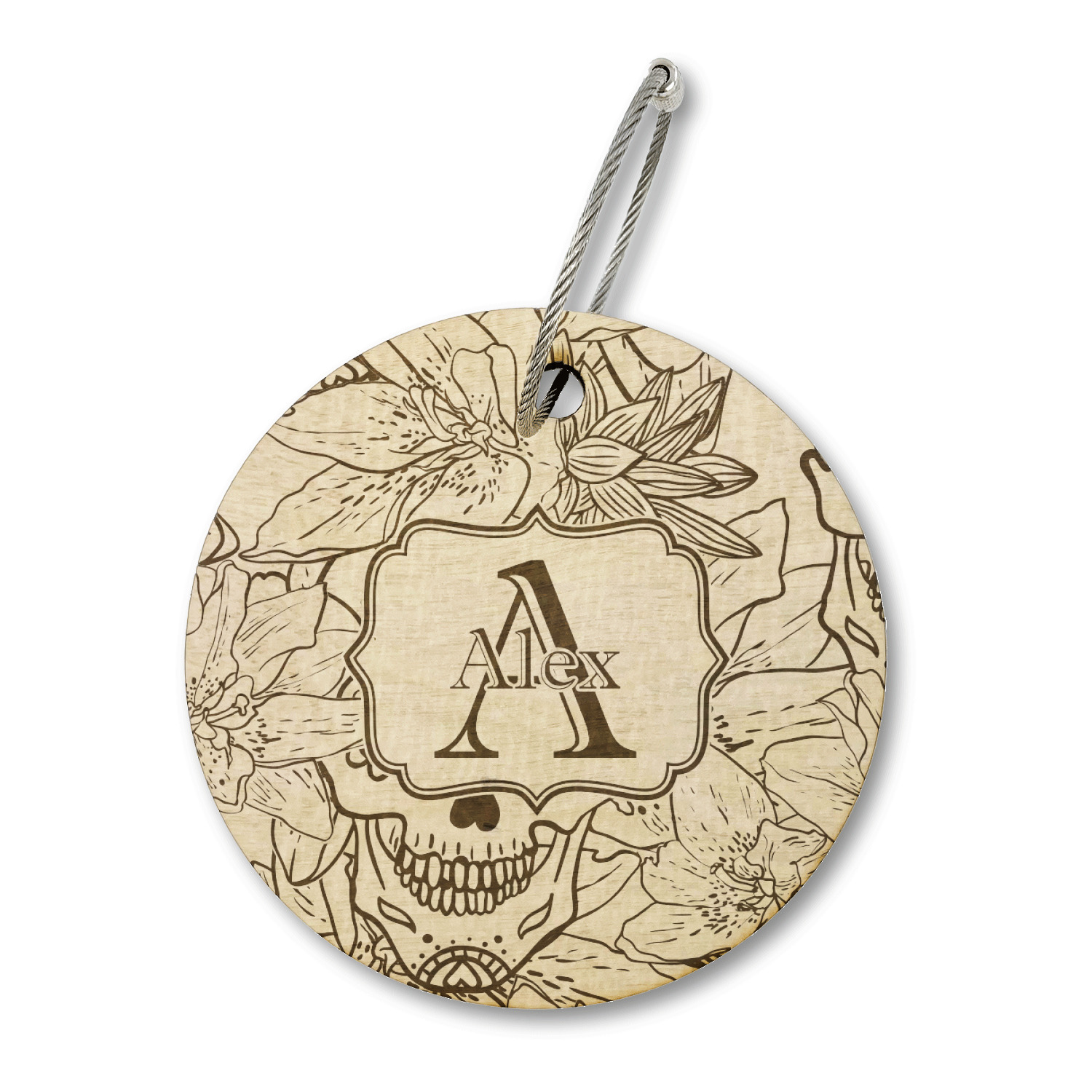 Amidst the flowers and smiling skulls, a label rests in the center, the perfect place for the personalization of your choice.