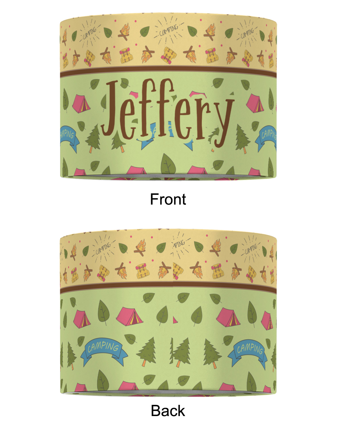 Your name or text fits on the space underneath the brown ribbon, on top of the green pattern. Both patterns have fun graphics that say the word "camping." Easily change the text to a saying or your own name. Take a peek at our camping graphics as well!