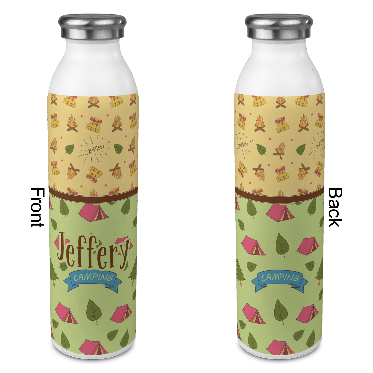 Your name or text fits on the space underneath the brown ribbon, on top of the green pattern. Both patterns have fun graphics that say the word "camping." Easily change the text to a saying or your own name. Take a peek at our camping graphics as well!