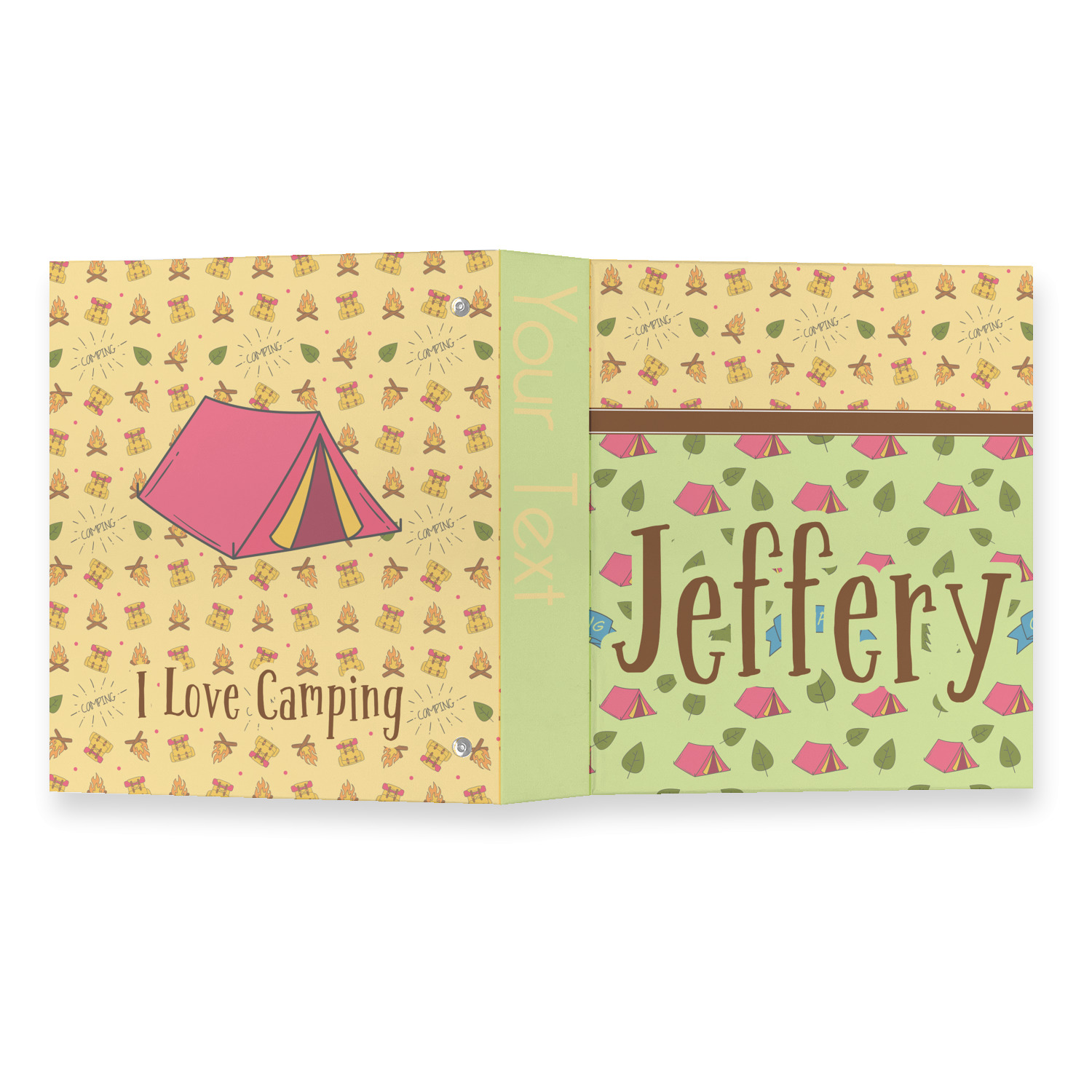 Your name or text fits on the space underneath the brown ribbon, on top of the green pattern. Both patterns have fun graphics that say the word "camping." Easily change the text to a saying or your own name. Take a peek at our camping graphics as well!