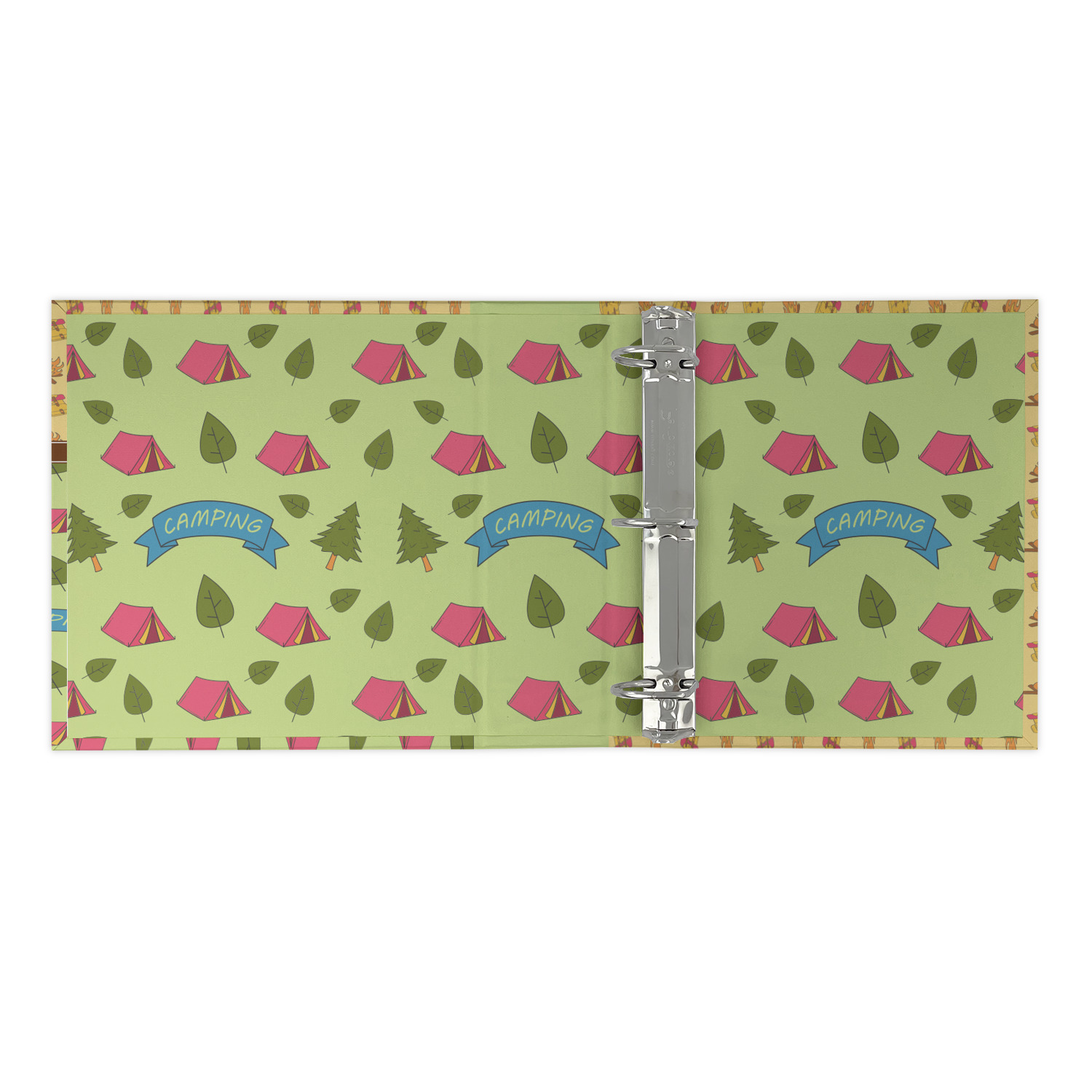 The design is split into two sections with two different patterns. This asymmetrical design has a fun green pattern with red tents and surrounding leaves and trees. This pattern takes up 2/3 of the design. The other 1/3 of the design is filled with a yellow pattern that has campfires and backpacks on it. They are divided by a brown ribbon.