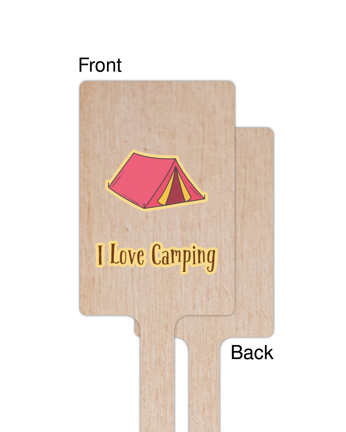 Your name or text fits on the space underneath the brown ribbon, on top of the green pattern. Both patterns have fun graphics that say the word "camping." Easily change the text to a saying or your own name. Take a peek at our camping graphics as well!