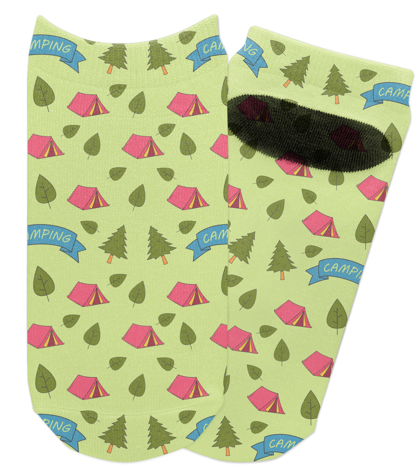The design is split into two sections with two different patterns. This asymmetrical design has a fun green pattern with red tents and surrounding leaves and trees. This pattern takes up 2/3 of the design. The other 1/3 of the design is filled with a yellow pattern that has campfires and backpacks on it. They are divided by a brown ribbon.