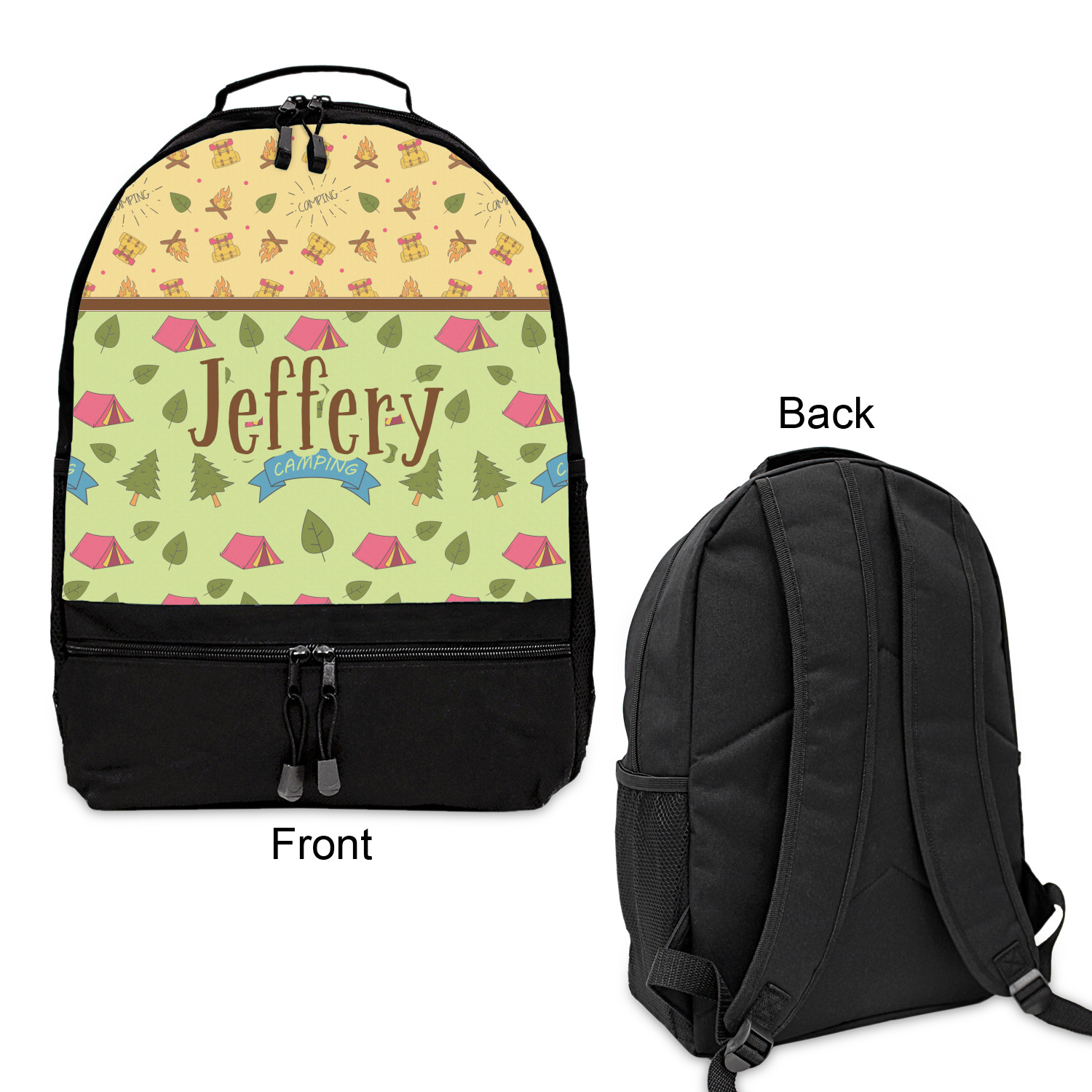 The design is split into two sections with two different patterns. This asymmetrical design has a fun green pattern with red tents and surrounding leaves and trees. This pattern takes up 2/3 of the design. The other 1/3 of the design is filled with a yellow pattern that has campfires and backpacks on it. They are divided by a brown ribbon.