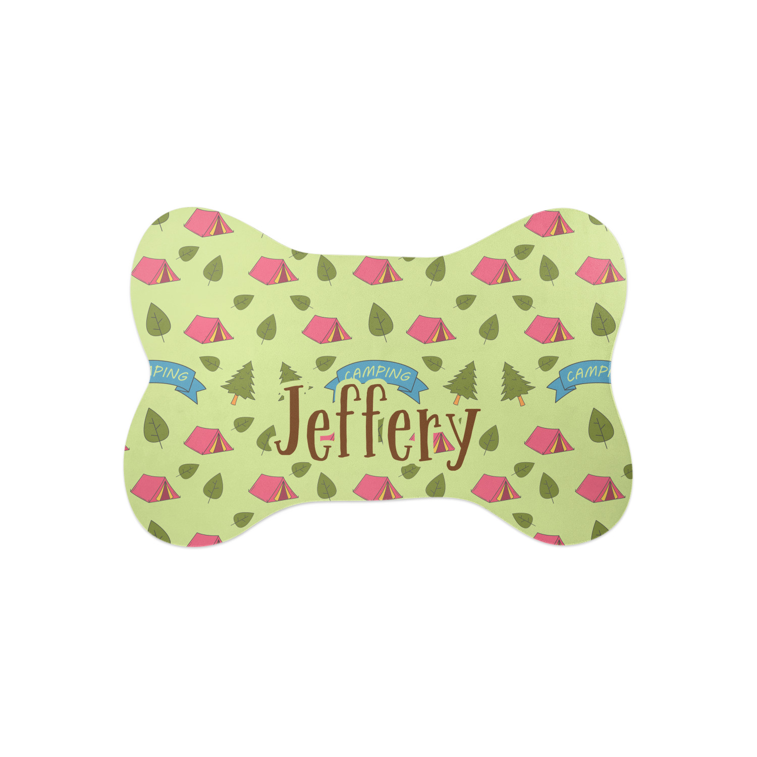 Your name or text fits on the space underneath the brown ribbon, on top of the green pattern. Both patterns have fun graphics that say the word "camping." Easily change the text to a saying or your own name. Take a peek at our camping graphics as well!