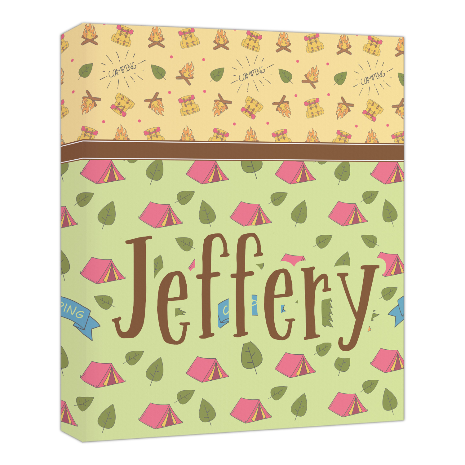 Your name or text fits on the space underneath the brown ribbon, on top of the green pattern. Both patterns have fun graphics that say the word "camping." Easily change the text to a saying or your own name. Take a peek at our camping graphics as well!