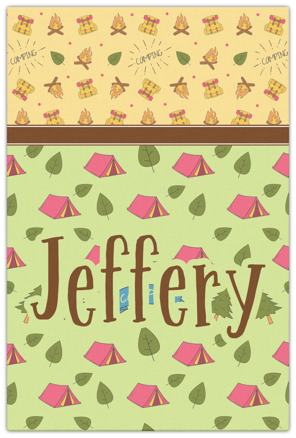 Your name or text fits on the space underneath the brown ribbon, on top of the green pattern. Both patterns have fun graphics that say the word "camping." Easily change the text to a saying or your own name. Take a peek at our camping graphics as well!
