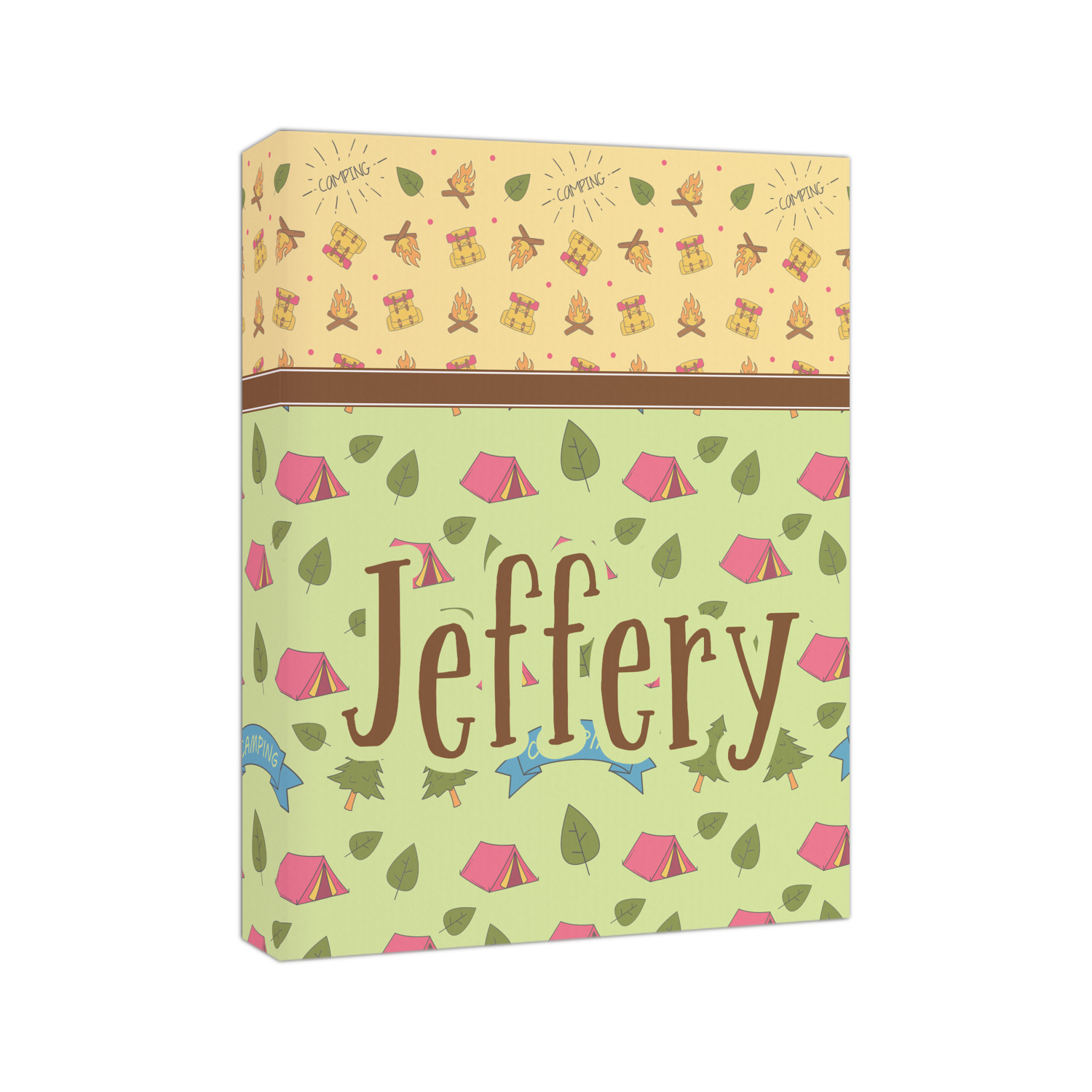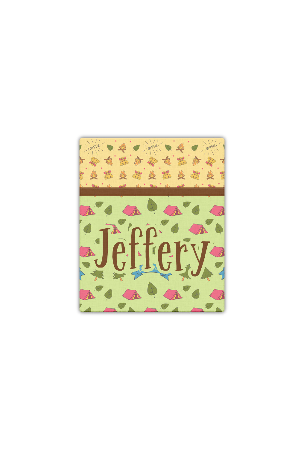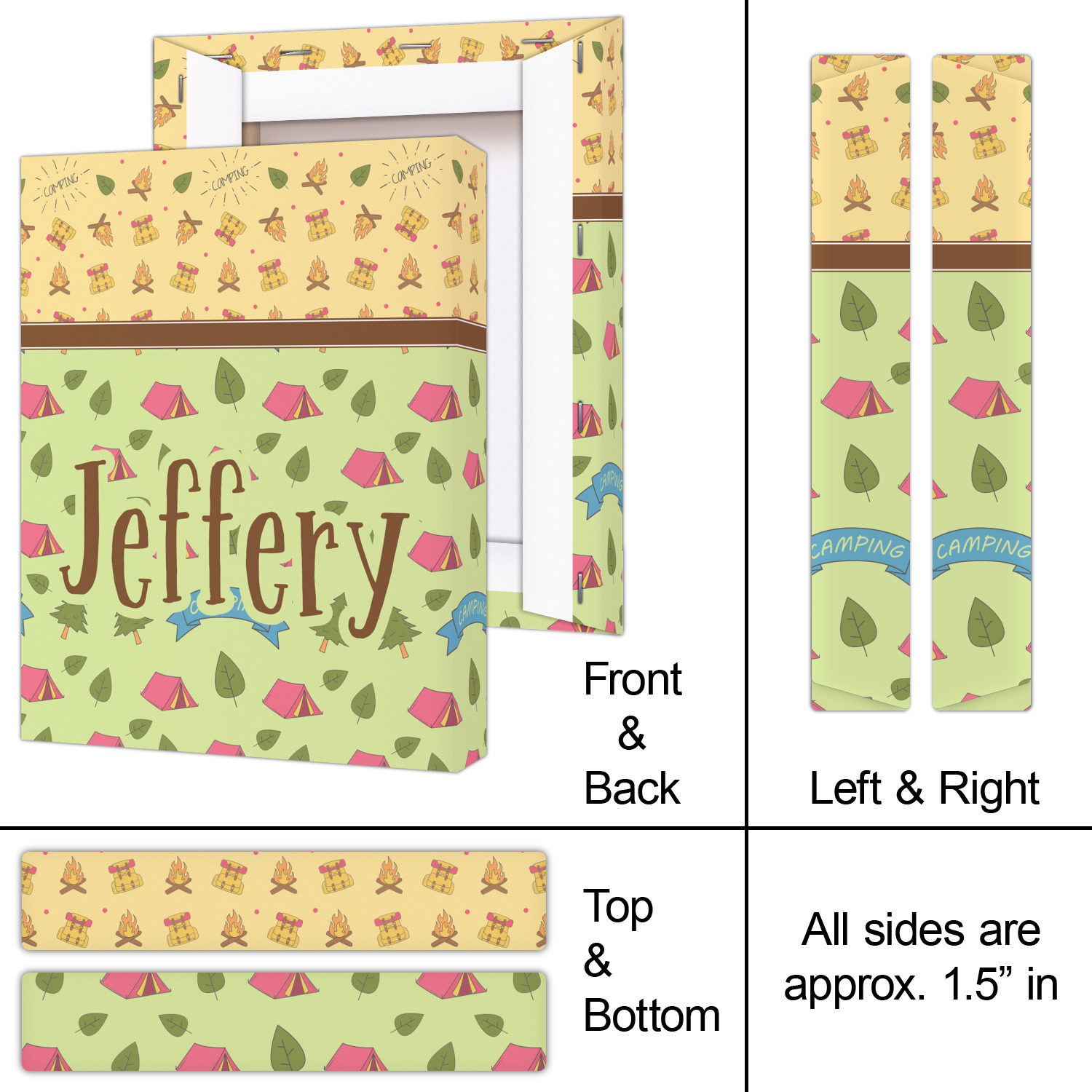 Your name or text fits on the space underneath the brown ribbon, on top of the green pattern. Both patterns have fun graphics that say the word "camping." Easily change the text to a saying or your own name. Take a peek at our camping graphics as well!