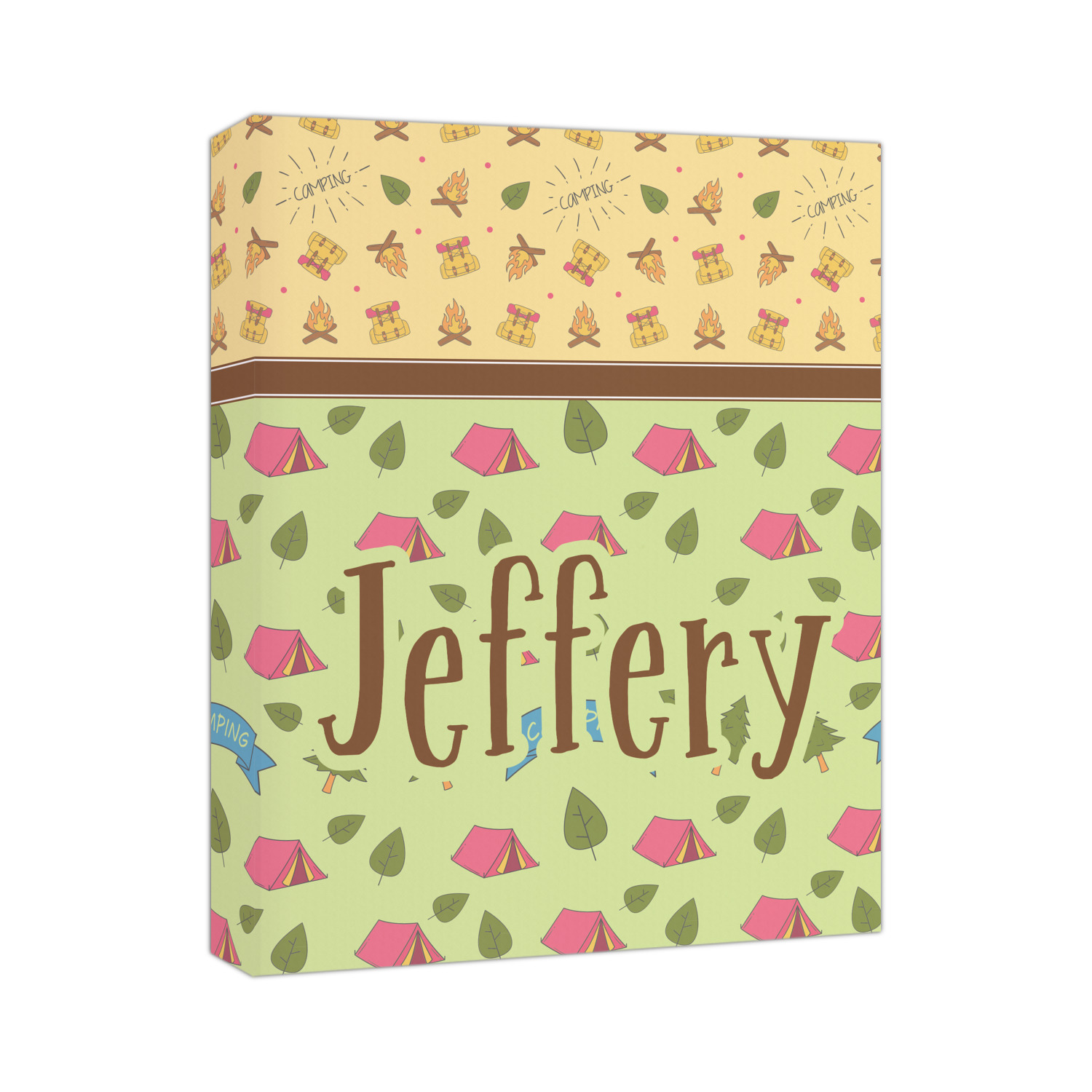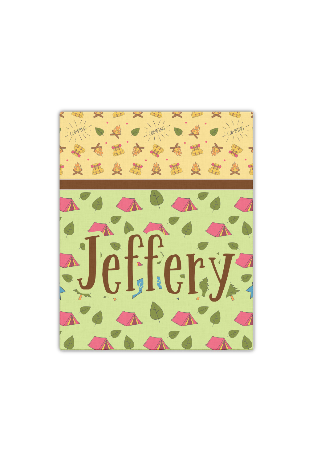 Your name or text fits on the space underneath the brown ribbon, on top of the green pattern. Both patterns have fun graphics that say the word "camping." Easily change the text to a saying or your own name. Take a peek at our camping graphics as well!