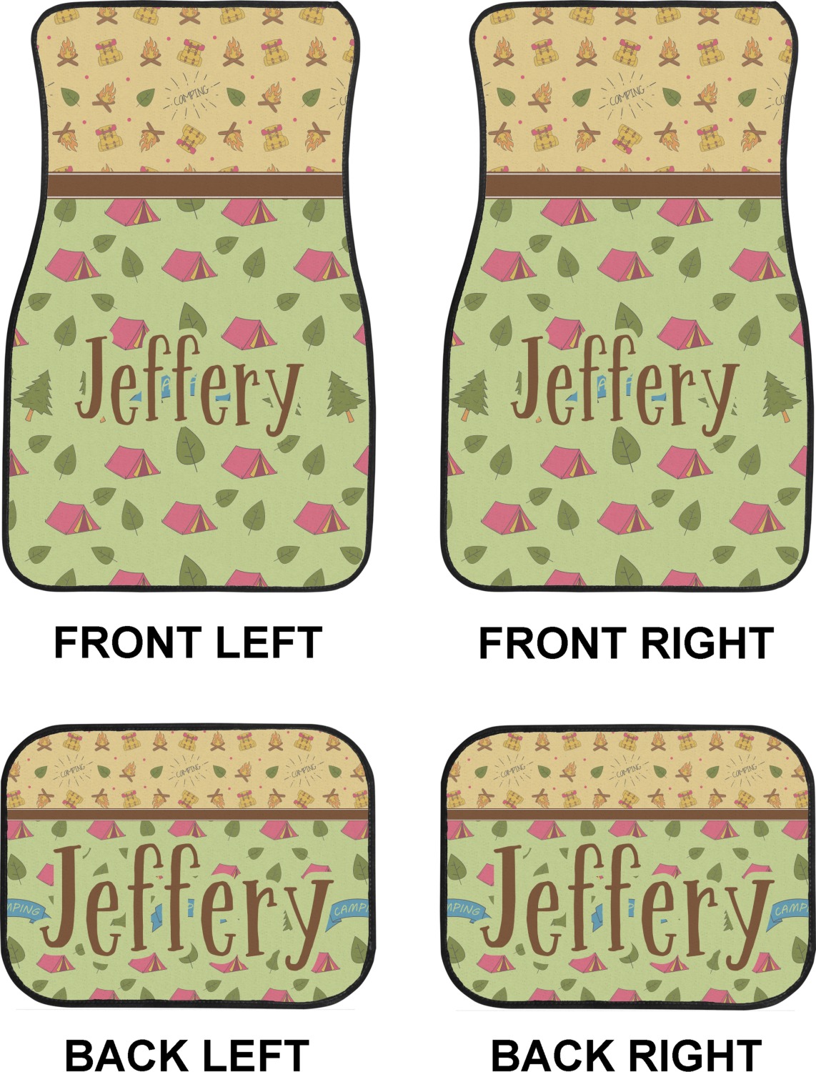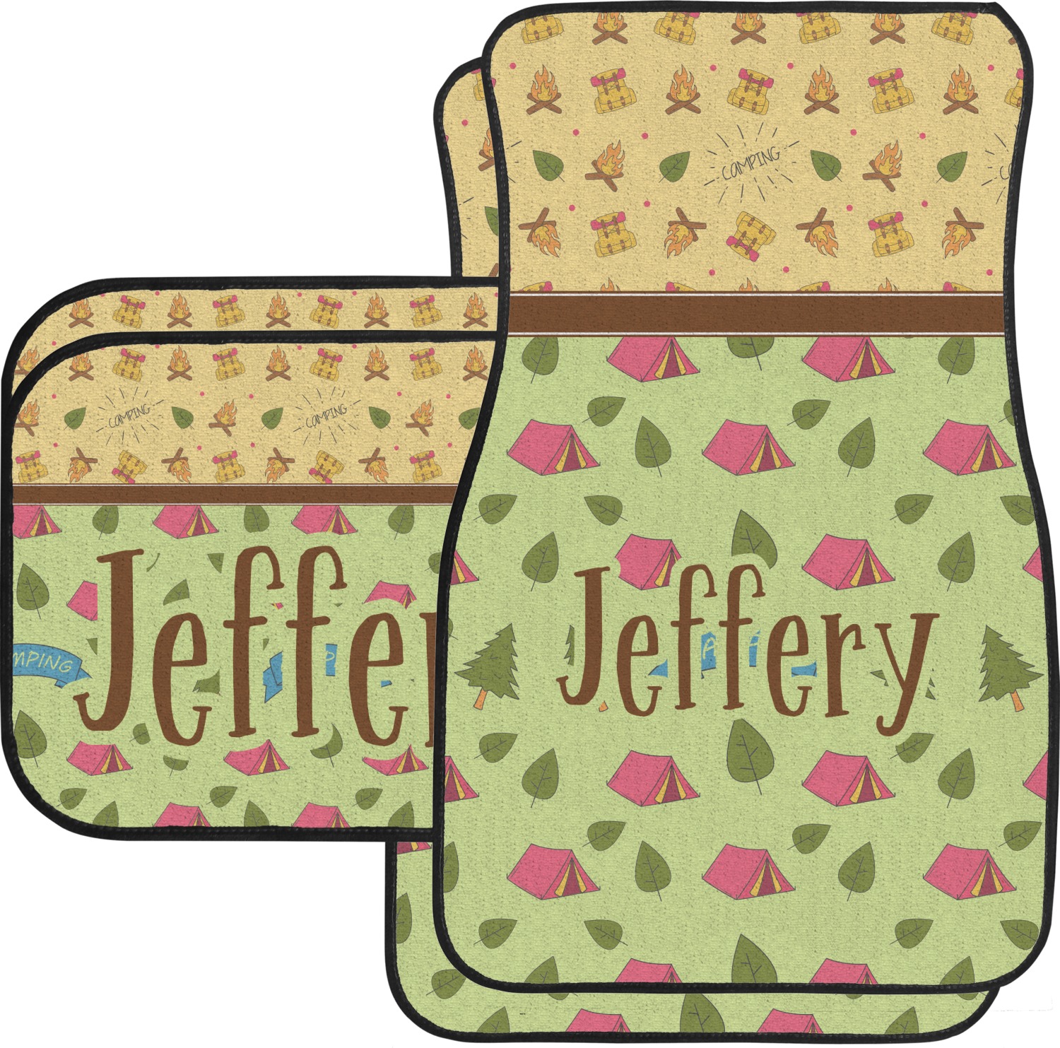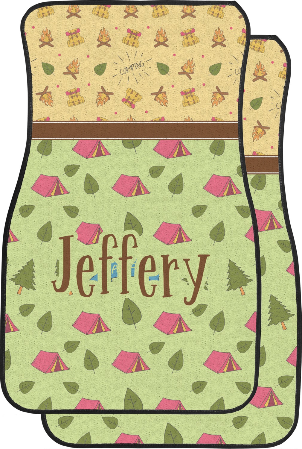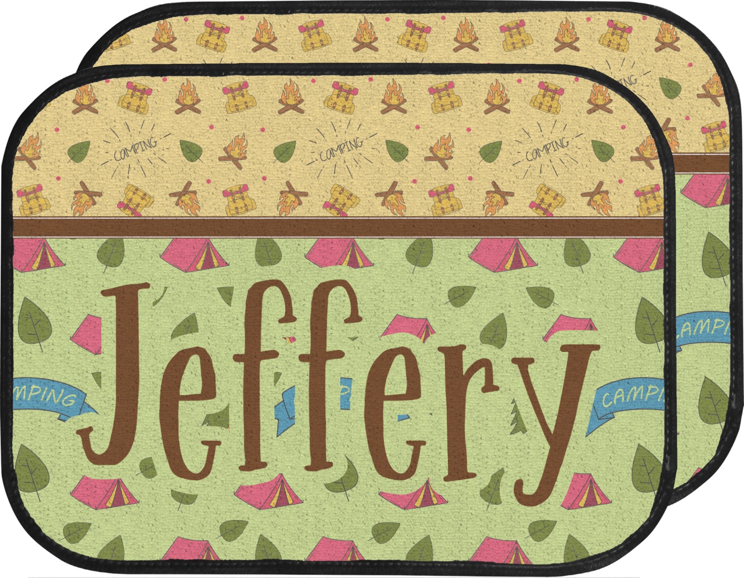 Your name or text fits on the space underneath the brown ribbon, on top of the green pattern. Both patterns have fun graphics that say the word "camping." Easily change the text to a saying or your own name. Take a peek at our camping graphics as well!
