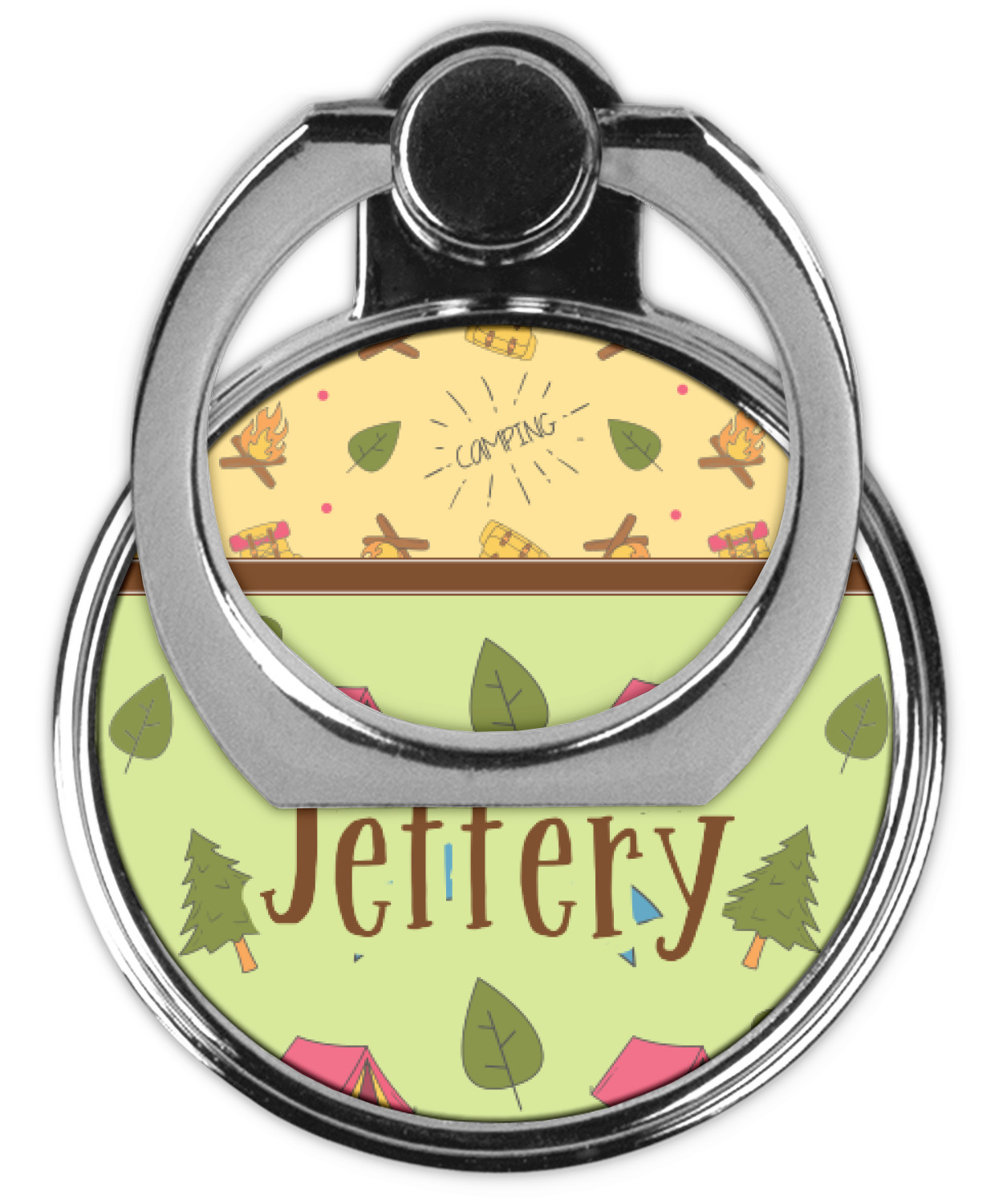 Your name or text fits on the space underneath the brown ribbon, on top of the green pattern. Both patterns have fun graphics that say the word "camping." Easily change the text to a saying or your own name. Take a peek at our camping graphics as well!