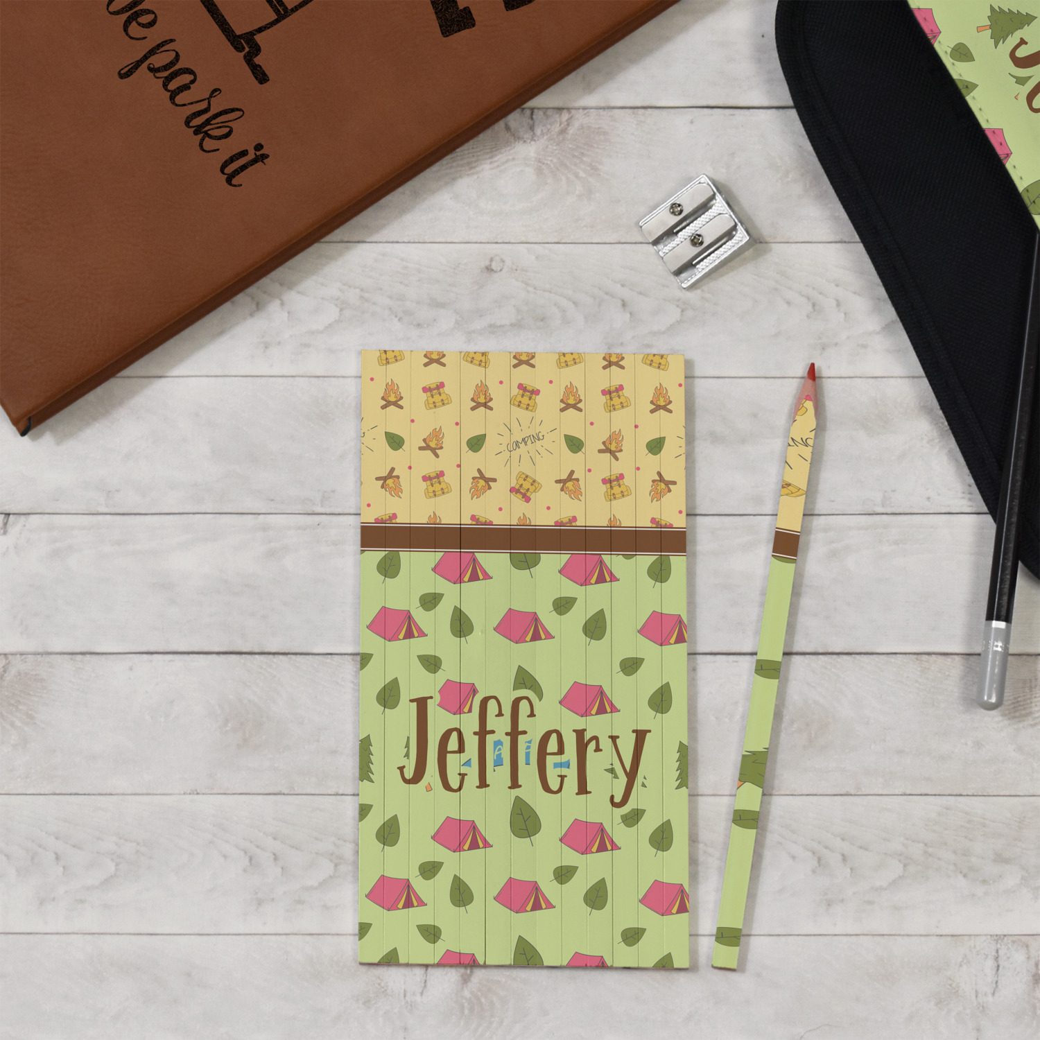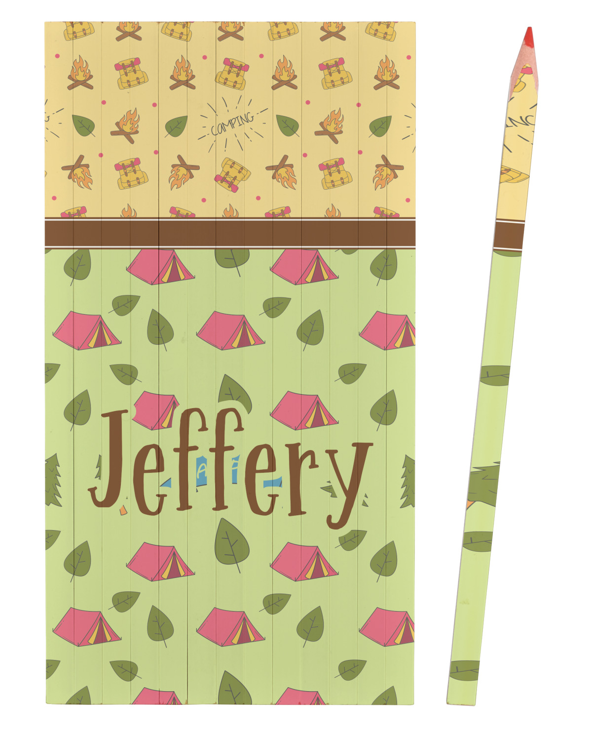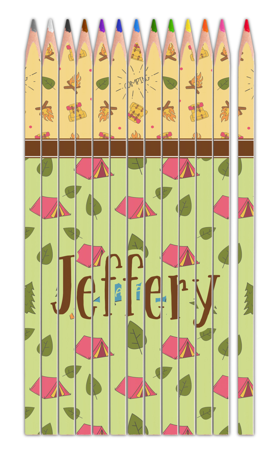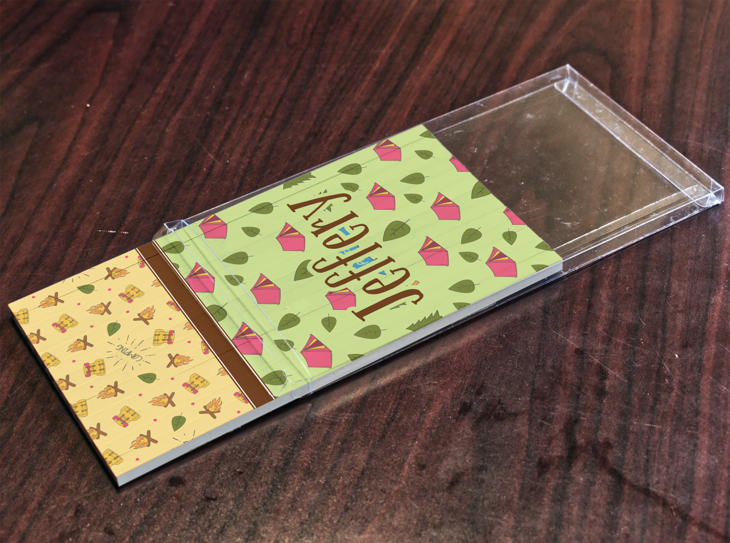 Your name or text fits on the space underneath the brown ribbon, on top of the green pattern. Both patterns have fun graphics that say the word "camping." Easily change the text to a saying or your own name. Take a peek at our camping graphics as well!