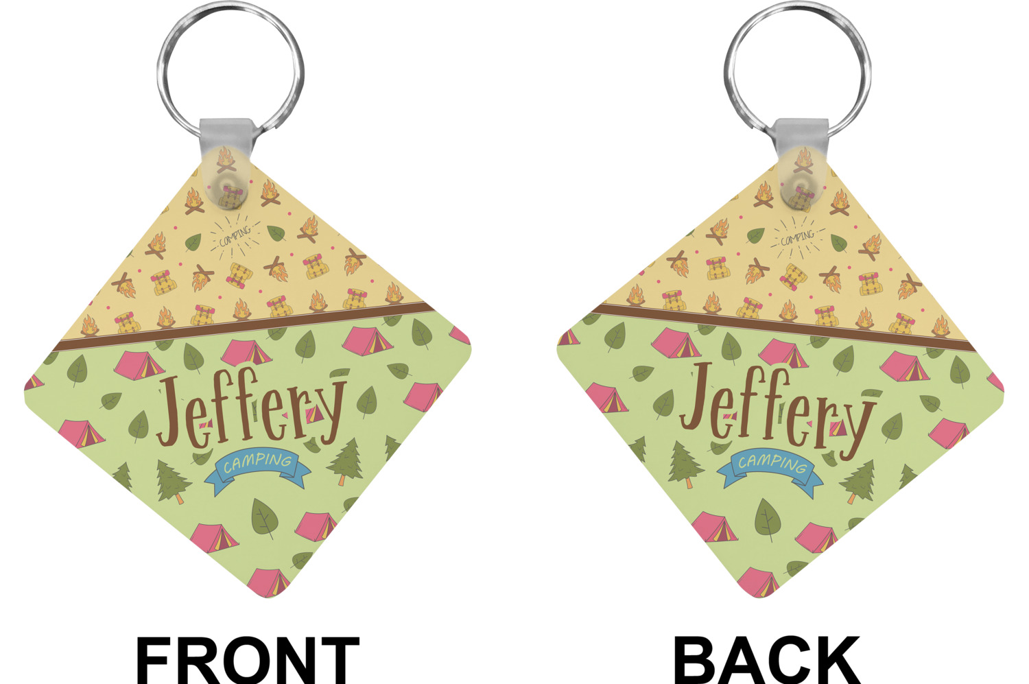 Your name or text fits on the space underneath the brown ribbon, on top of the green pattern. Both patterns have fun graphics that say the word "camping." Easily change the text to a saying or your own name. Take a peek at our camping graphics as well!