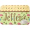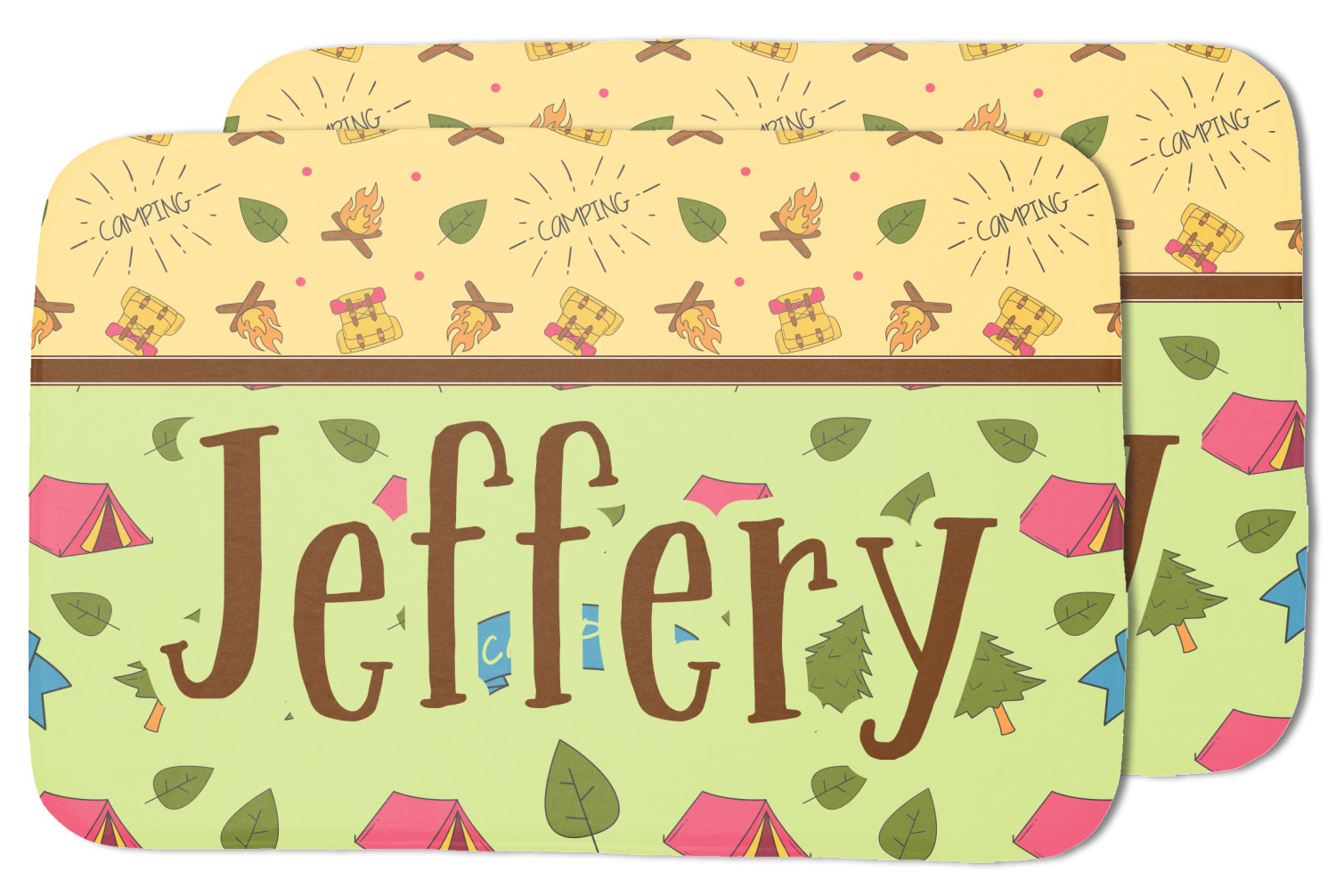 Your name or text fits on the space underneath the brown ribbon, on top of the green pattern. Both patterns have fun graphics that say the word "camping." Easily change the text to a saying or your own name. Take a peek at our camping graphics as well!