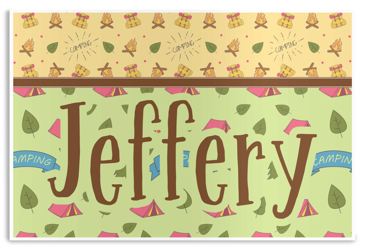Your name or text fits on the space underneath the brown ribbon, on top of the green pattern. Both patterns have fun graphics that say the word "camping." Easily change the text to a saying or your own name. Take a peek at our camping graphics as well!