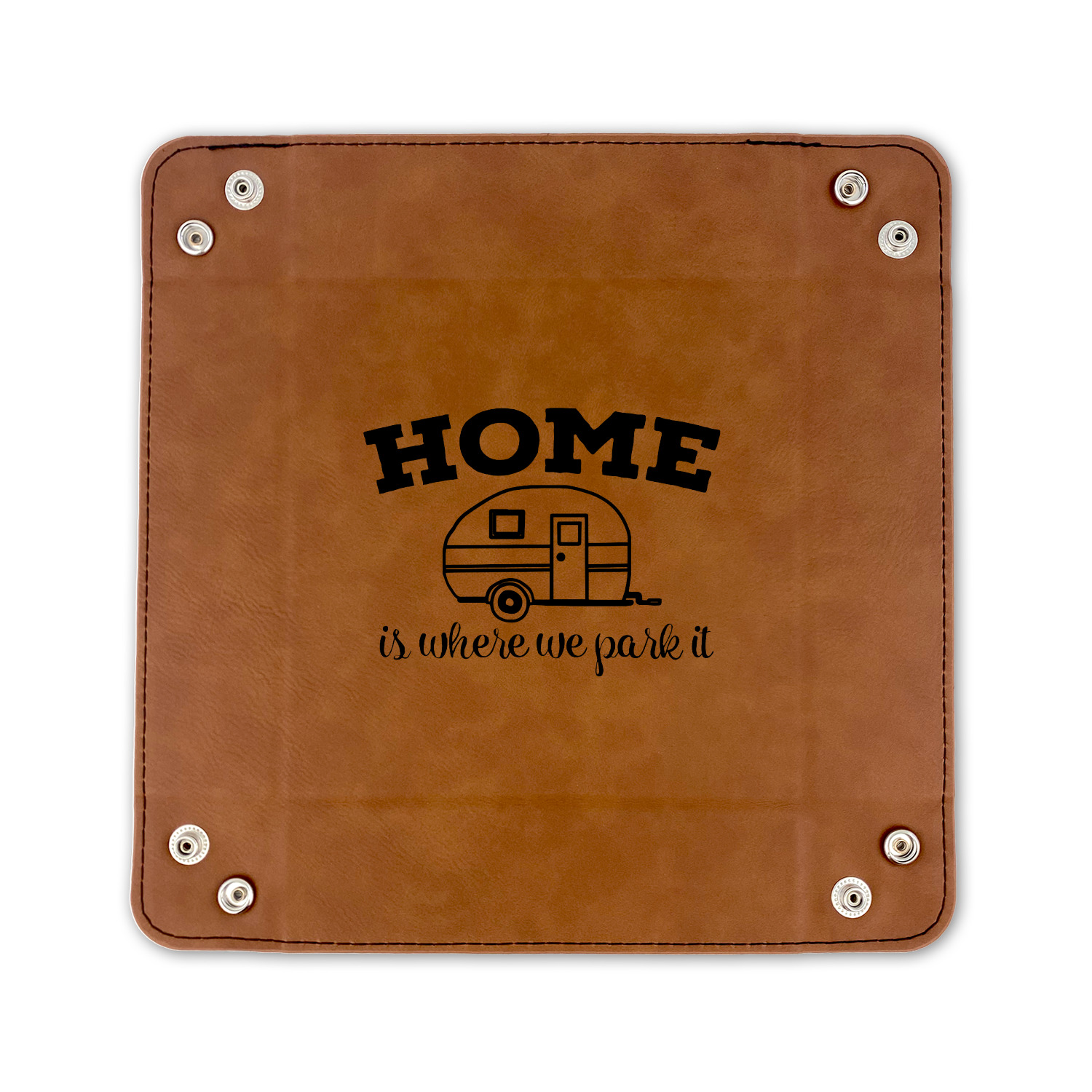 The leatherette wraps the hard board base and sides with flexible hinges to fold the sides up. The corners are secured using silver snaps. The 6in x 6 in tray measures approximately 9.5in x 9.5in when laid flat. The 9in x 9in tray measures approximately 13in x 13in when laid flat.