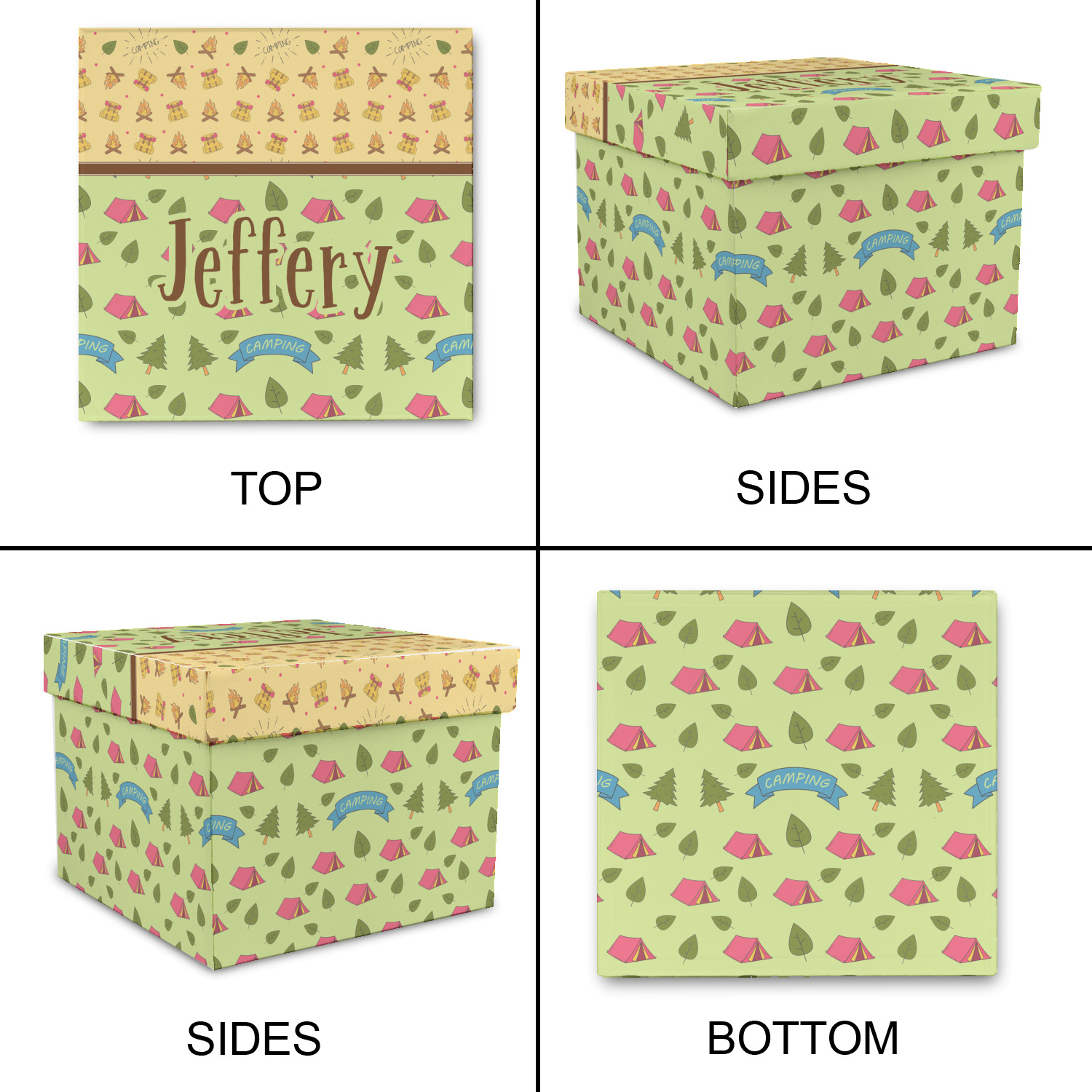 Your name or text fits on the space underneath the brown ribbon, on top of the green pattern. Both patterns have fun graphics that say the word "camping." Easily change the text to a saying or your own name. Take a peek at our camping graphics as well!