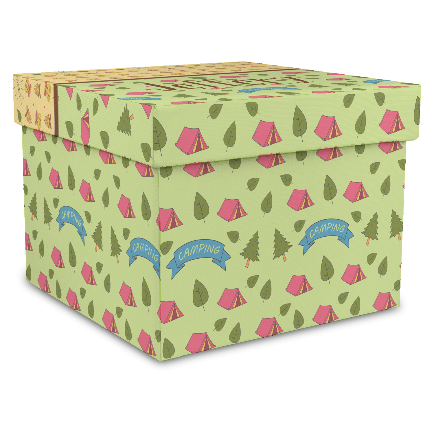 The design is split into two sections with two different patterns. This asymmetrical design has a fun green pattern with red tents and surrounding leaves and trees. This pattern takes up 2/3 of the design. The other 1/3 of the design is filled with a yellow pattern that has campfires and backpacks on it. They are divided by a brown ribbon.