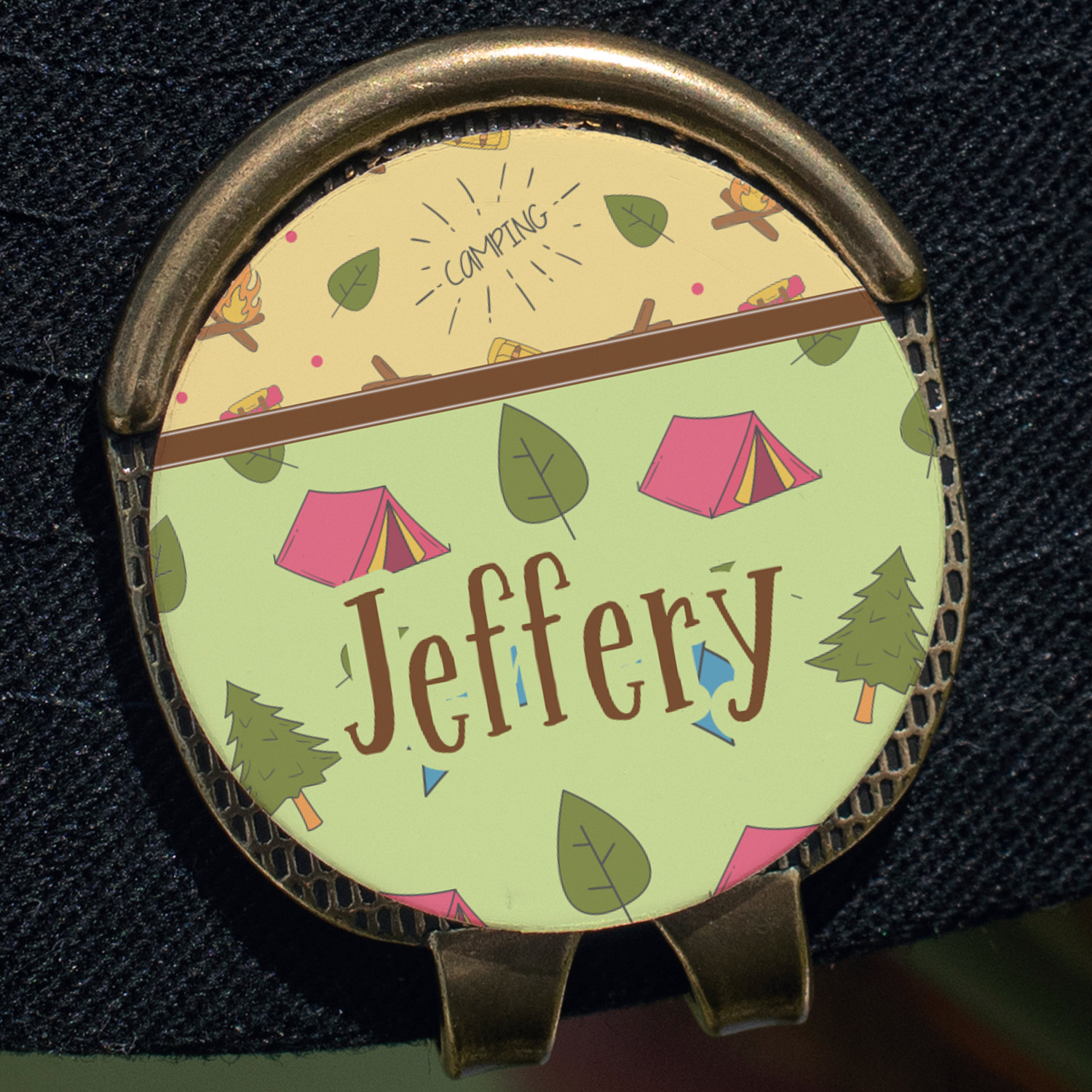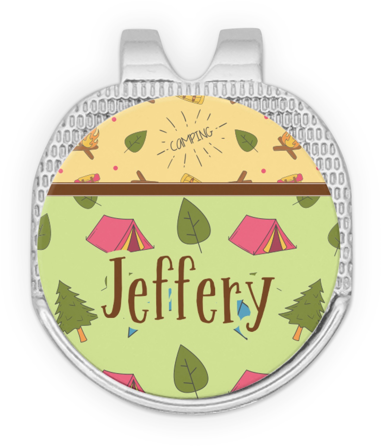 Your name or text fits on the space underneath the brown ribbon, on top of the green pattern. Both patterns have fun graphics that say the word "camping." Easily change the text to a saying or your own name. Take a peek at our camping graphics as well!
