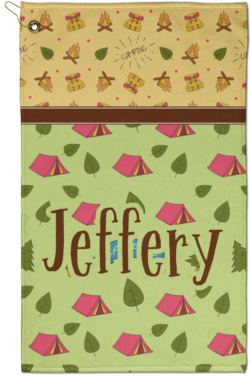 Your name or text fits on the space underneath the brown ribbon, on top of the green pattern. Both patterns have fun graphics that say the word "camping." Easily change the text to a saying or your own name. Take a peek at our camping graphics as well!