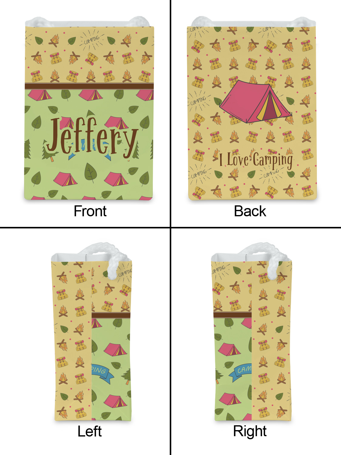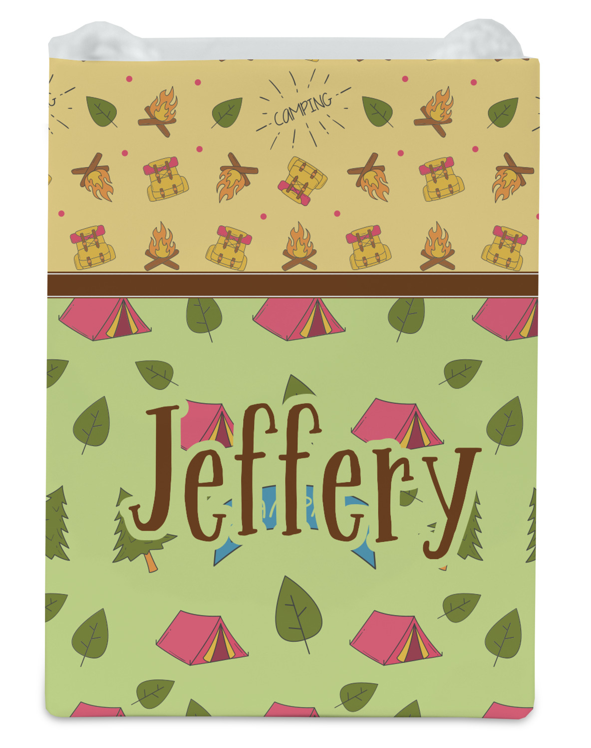 Your name or text fits on the space underneath the brown ribbon, on top of the green pattern. Both patterns have fun graphics that say the word "camping." Easily change the text to a saying or your own name. Take a peek at our camping graphics as well!
