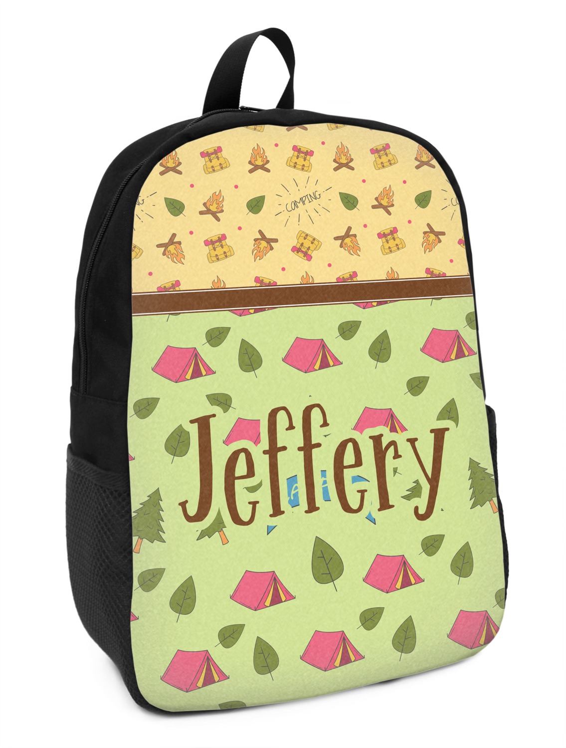 The design is split into two sections with two different patterns. This asymmetrical design has a fun green pattern with red tents and surrounding leaves and trees. This pattern takes up 2/3 of the design. The other 1/3 of the design is filled with a yellow pattern that has campfires and backpacks on it. They are divided by a brown ribbon.