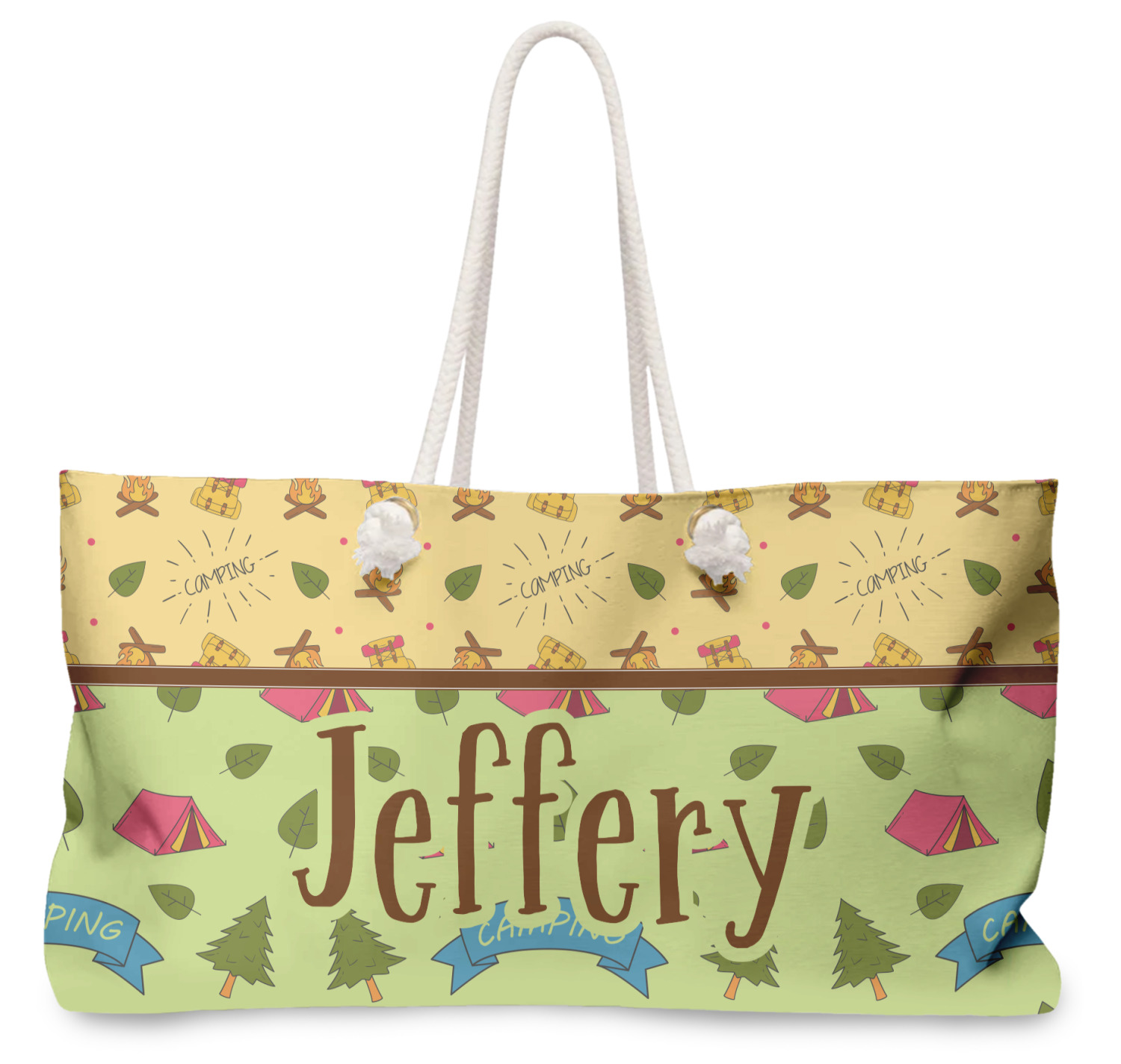 Our oversized weekender tote with rope handles is perfect for your weekend at the beach or on the town. This large tote are 24" W X 13" H, with a 5" gusset and a 27" thick rope handles with a knot that is put through a grommeted brass hole.