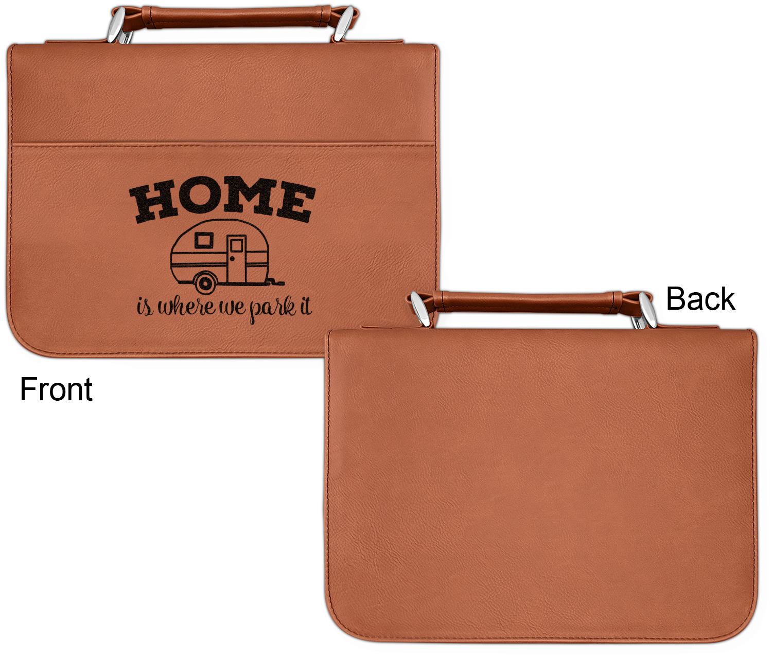 These book covers are fabricated from a fine leatherette in a warm, cognac shade of brown. A wide pocket spans across the front of the book jacket [2,400] and can store any loose papers or notes that you wish to keep. The interior of this personalized Bible cover includes slots on both sides to house the covers of your Bible, and keep it in place. The inside of the spine has a small elastic band to secure a pen. A zipper lines three sides of the cover, while the fourth side features a reinforced handle that allows for easy transport of your enclosed book.