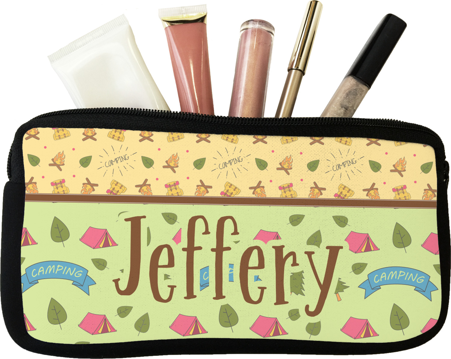 Our personalized makeup bags are available in many different designs, patterns and colors - so you are sure to find one that will love. They are made of neoprene (same material as wet-suits) and thus are water resistant, so spillages in your makeup bag will not end up all over you purse. They are customized on one side and are black on the other side and the zipper is black as well.