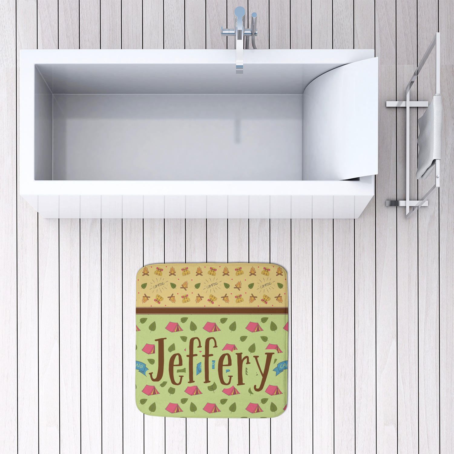 We offer this custom bath mat in four different sizes, so that you can choose the proper size for your bathroom and shower space. We suggest measuring the area before so that you can make an informed purchase. The four sizes are as follows: 24 by 17 inches, 34 by 21 inches, 48 by 36 inches, and 48 by 48 inches.
