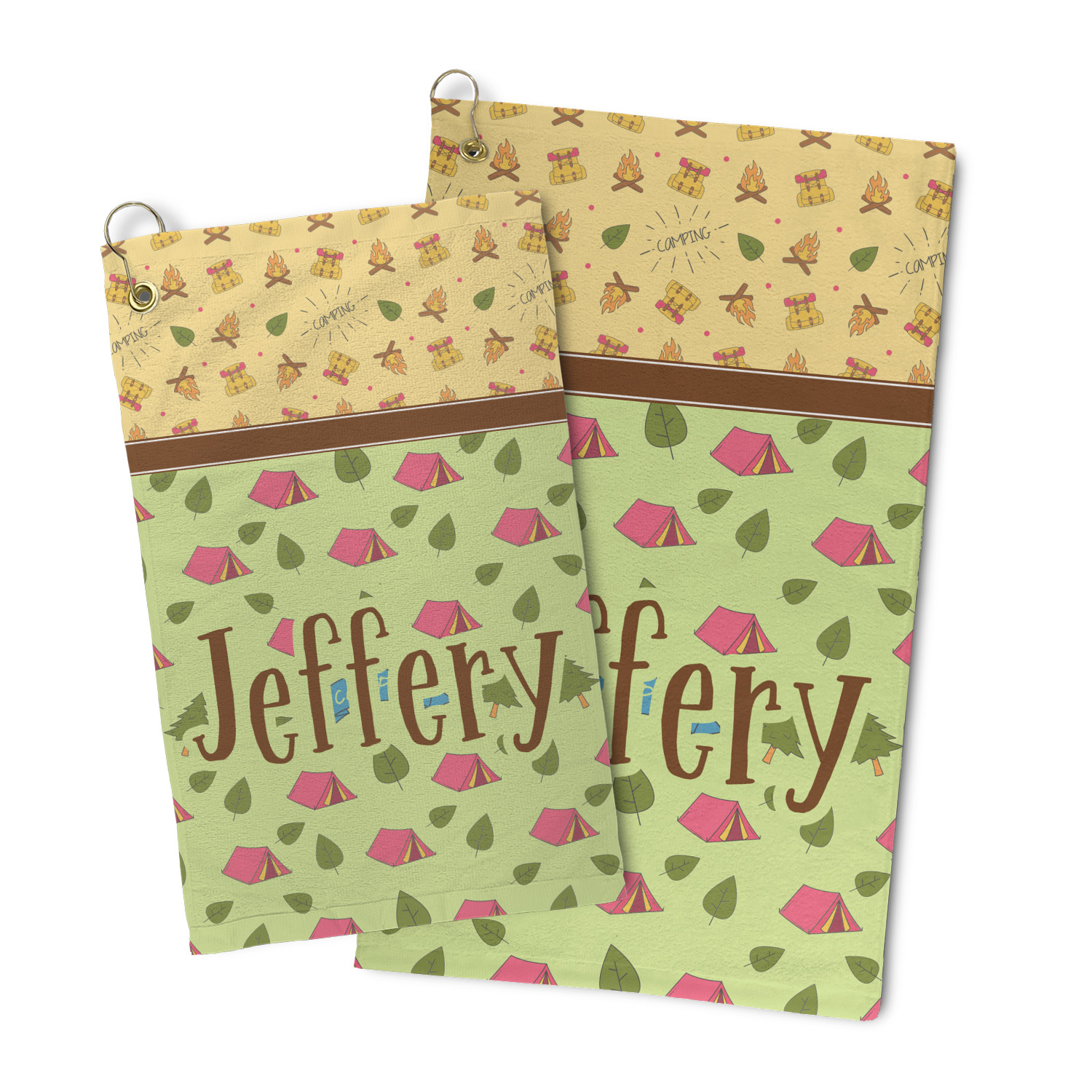Your name or text fits on the space underneath the brown ribbon, on top of the green pattern. Both patterns have fun graphics that say the word "camping." Easily change the text to a saying or your own name. Take a peek at our camping graphics as well!