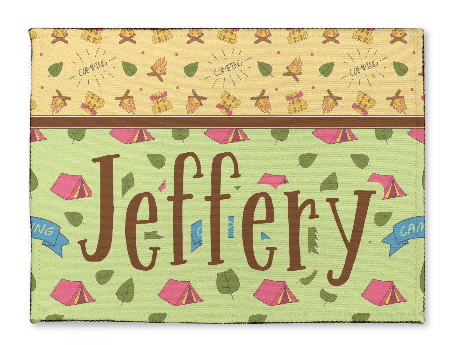 Your name or text fits on the space underneath the brown ribbon, on top of the green pattern. Both patterns have fun graphics that say the word "camping." Easily change the text to a saying or your own name. Take a peek at our camping graphics as well!