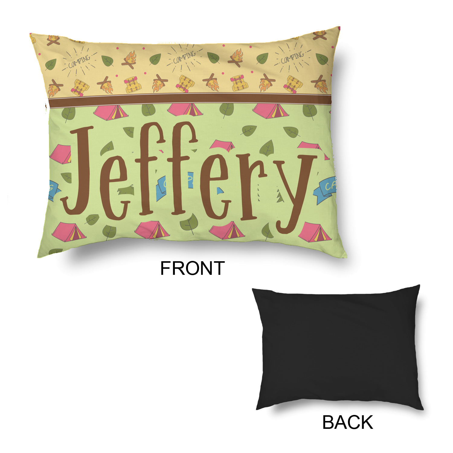 Your name or text fits on the space underneath the brown ribbon, on top of the green pattern. Both patterns have fun graphics that say the word "camping." Easily change the text to a saying or your own name. Take a peek at our camping graphics as well!