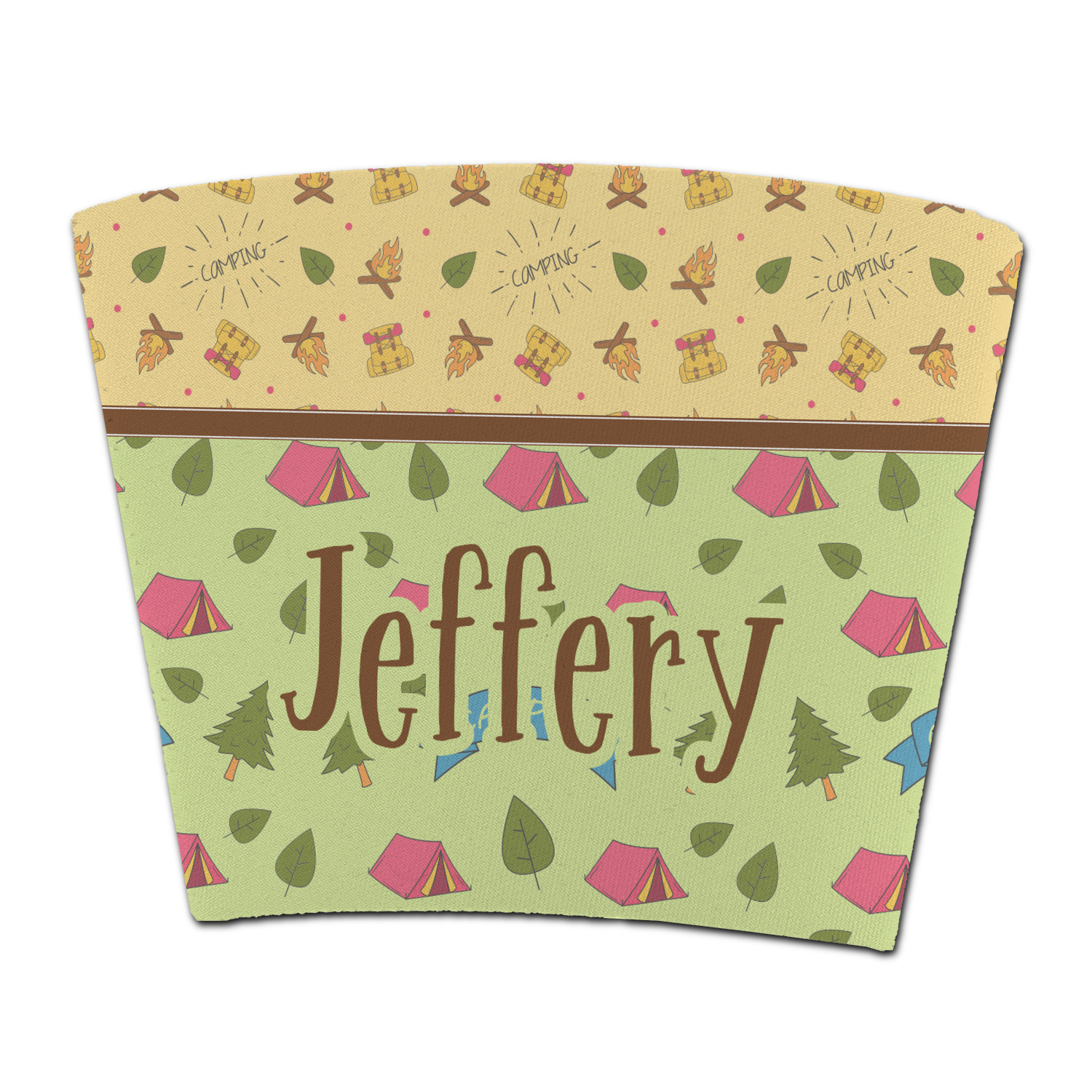 Your name or text fits on the space underneath the brown ribbon, on top of the green pattern. Both patterns have fun graphics that say the word "camping." Easily change the text to a saying or your own name. Take a peek at our camping graphics as well!