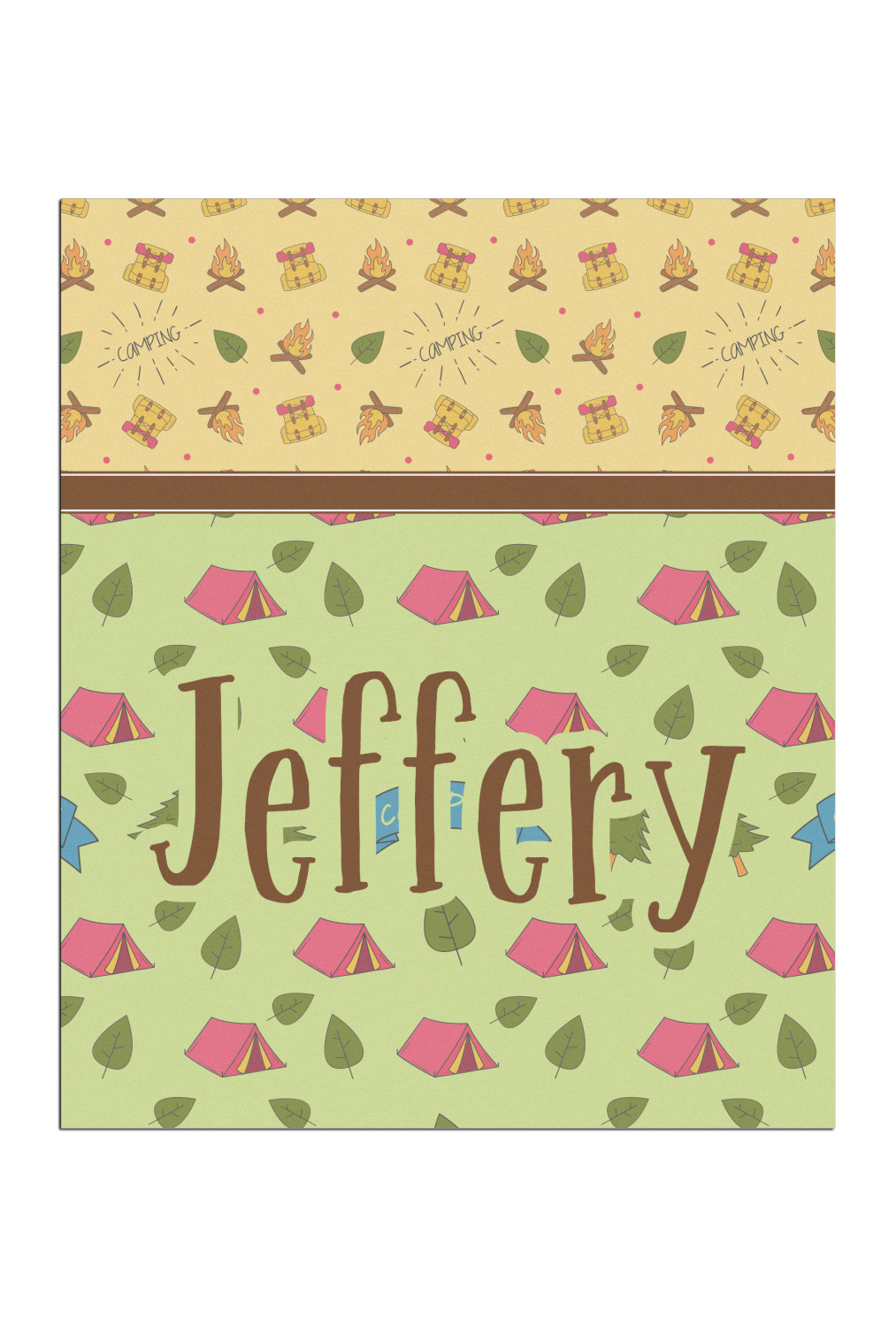 Your name or text fits on the space underneath the brown ribbon, on top of the green pattern. Both patterns have fun graphics that say the word "camping." Easily change the text to a saying or your own name. Take a peek at our camping graphics as well!