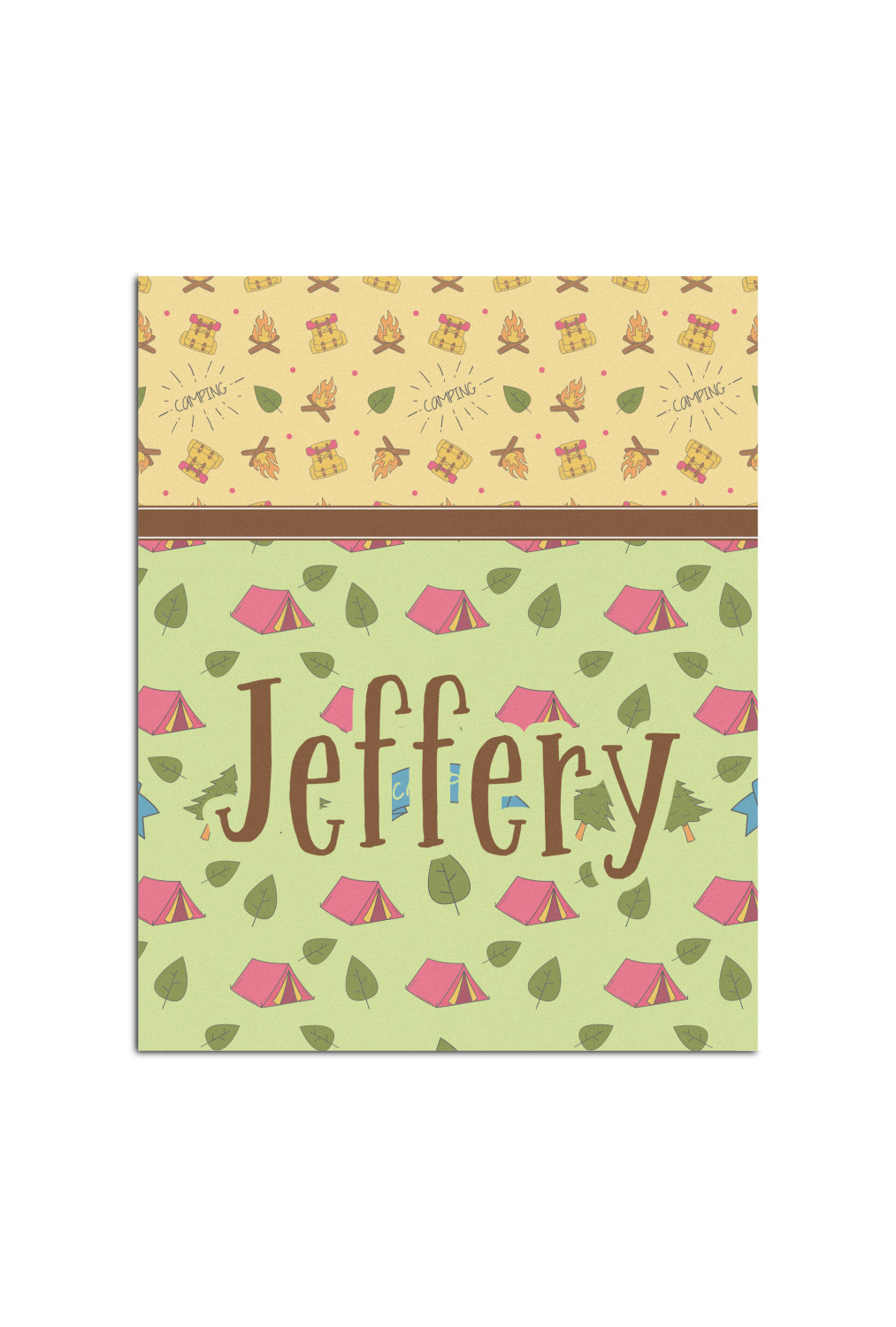 Your name or text fits on the space underneath the brown ribbon, on top of the green pattern. Both patterns have fun graphics that say the word "camping." Easily change the text to a saying or your own name. Take a peek at our camping graphics as well!