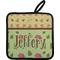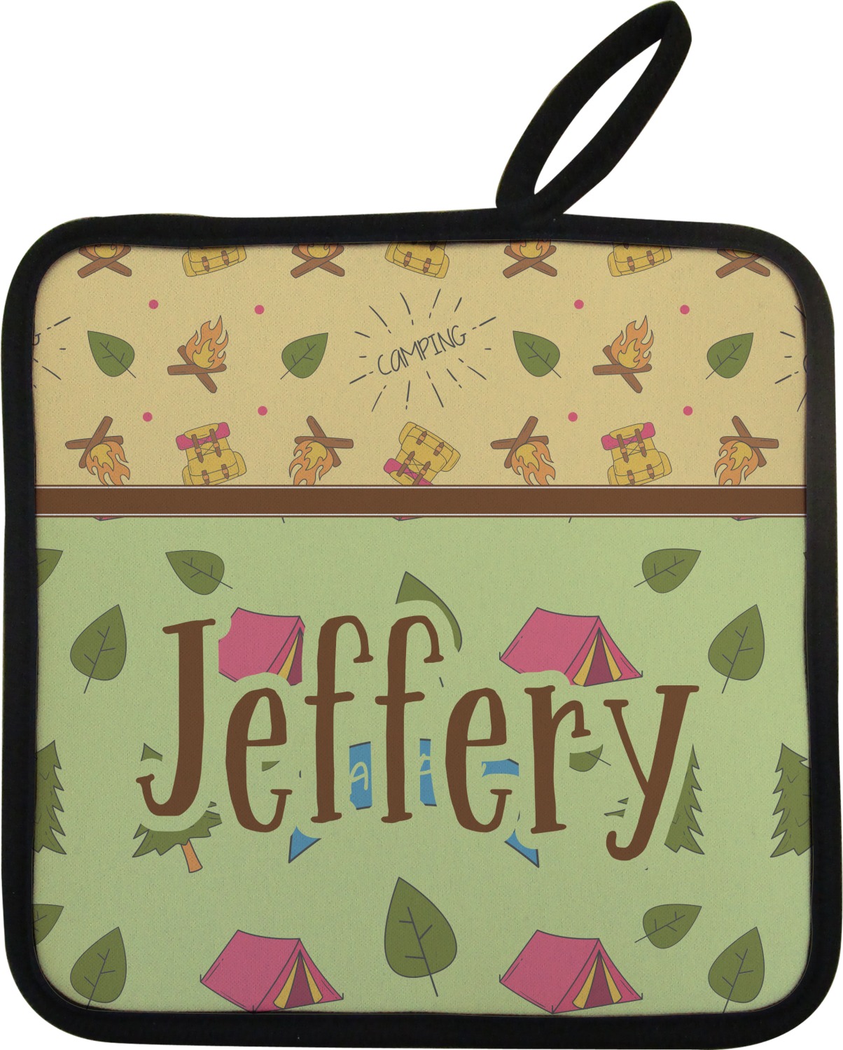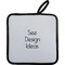 Our personalized pot holders feature a neoprene front that displays your personalization in vibrant colors. The backing of the hot pot holder is rubberized; the textured backing allows you to have a great grip when using this custom pot holder. The two materials are joined with a sleek, black trim, and the holder also includes an attached loop for hanging and storage. The pot holder is approximately 8.75 inches by 8.75 inches and 0.25 inches tall, while the fabric loop is 2.5 inches long. You can purchase a kitchen pot holder by itself or as a set of 2. We also offer a set including one pot holder and one oven mitt.