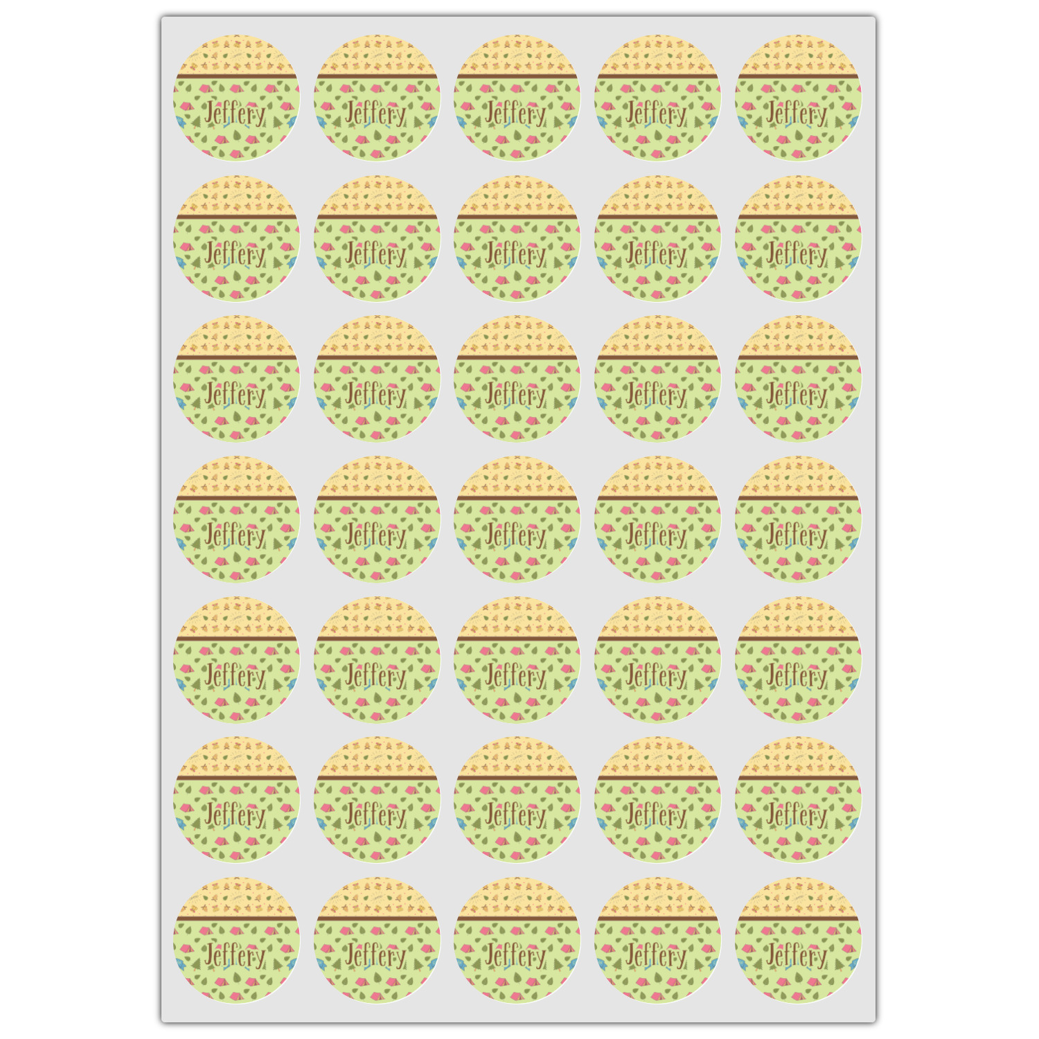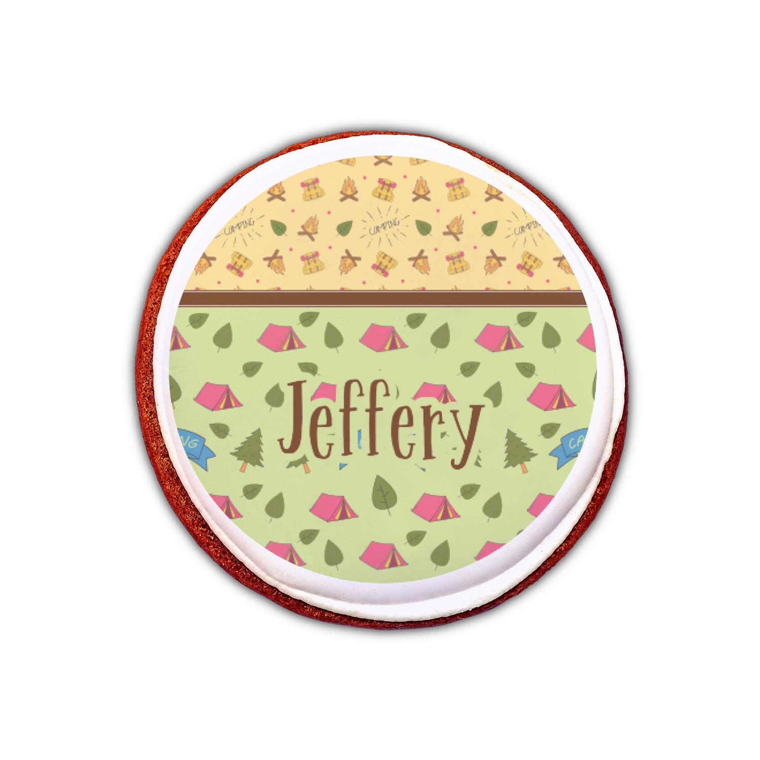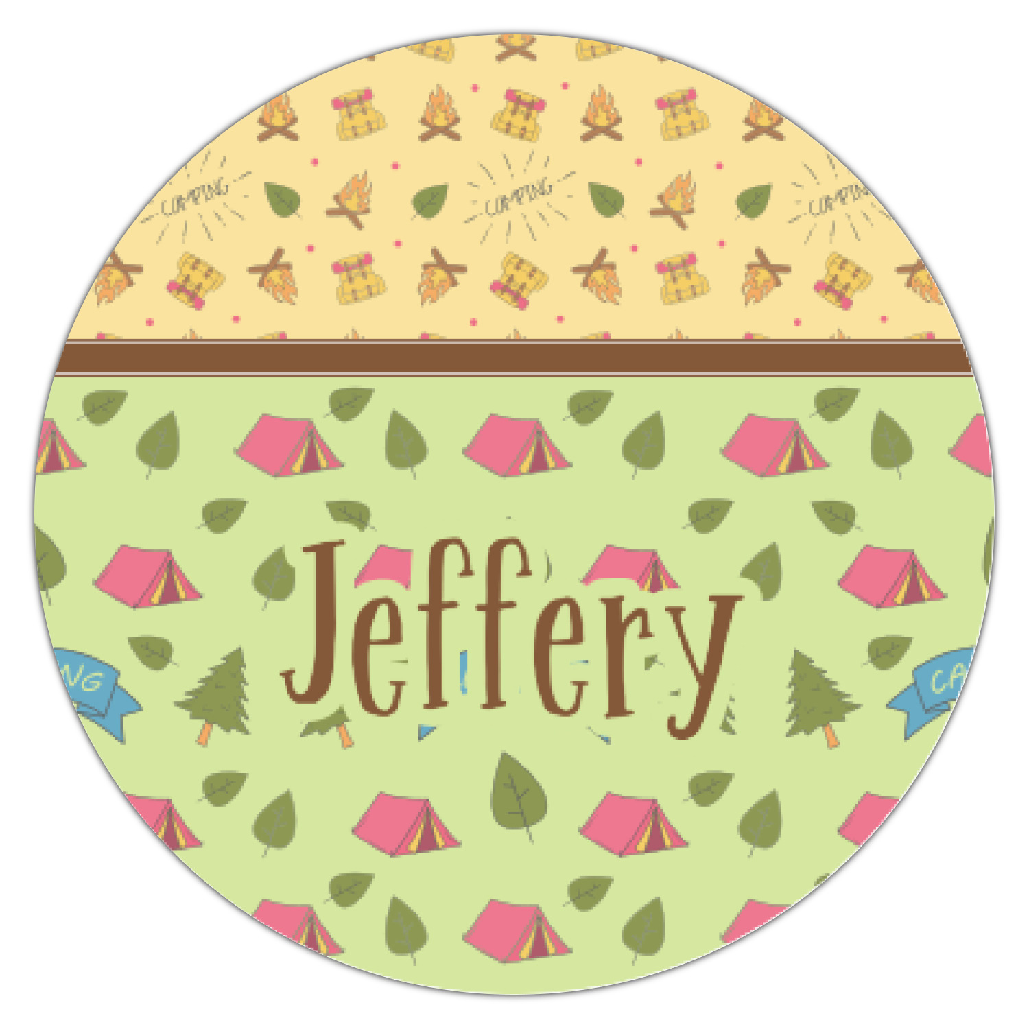 Your name or text fits on the space underneath the brown ribbon, on top of the green pattern. Both patterns have fun graphics that say the word "camping." Easily change the text to a saying or your own name. Take a peek at our camping graphics as well!