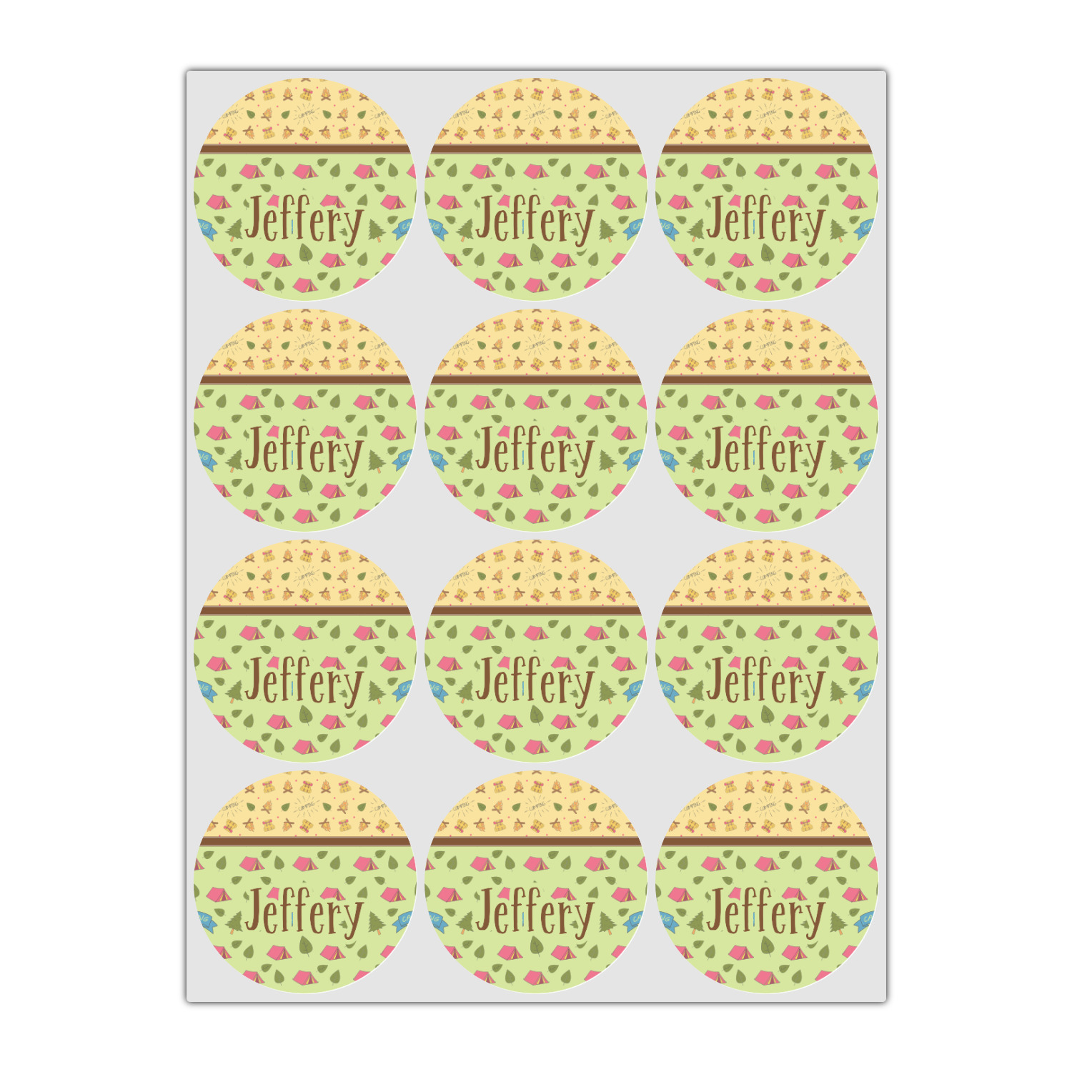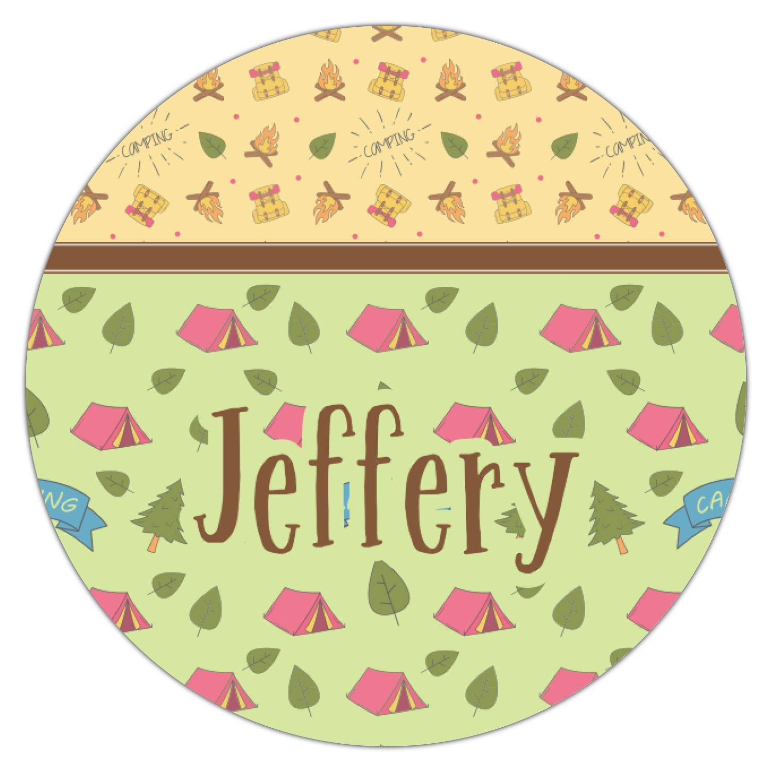 Your name or text fits on the space underneath the brown ribbon, on top of the green pattern. Both patterns have fun graphics that say the word "camping." Easily change the text to a saying or your own name. Take a peek at our camping graphics as well!