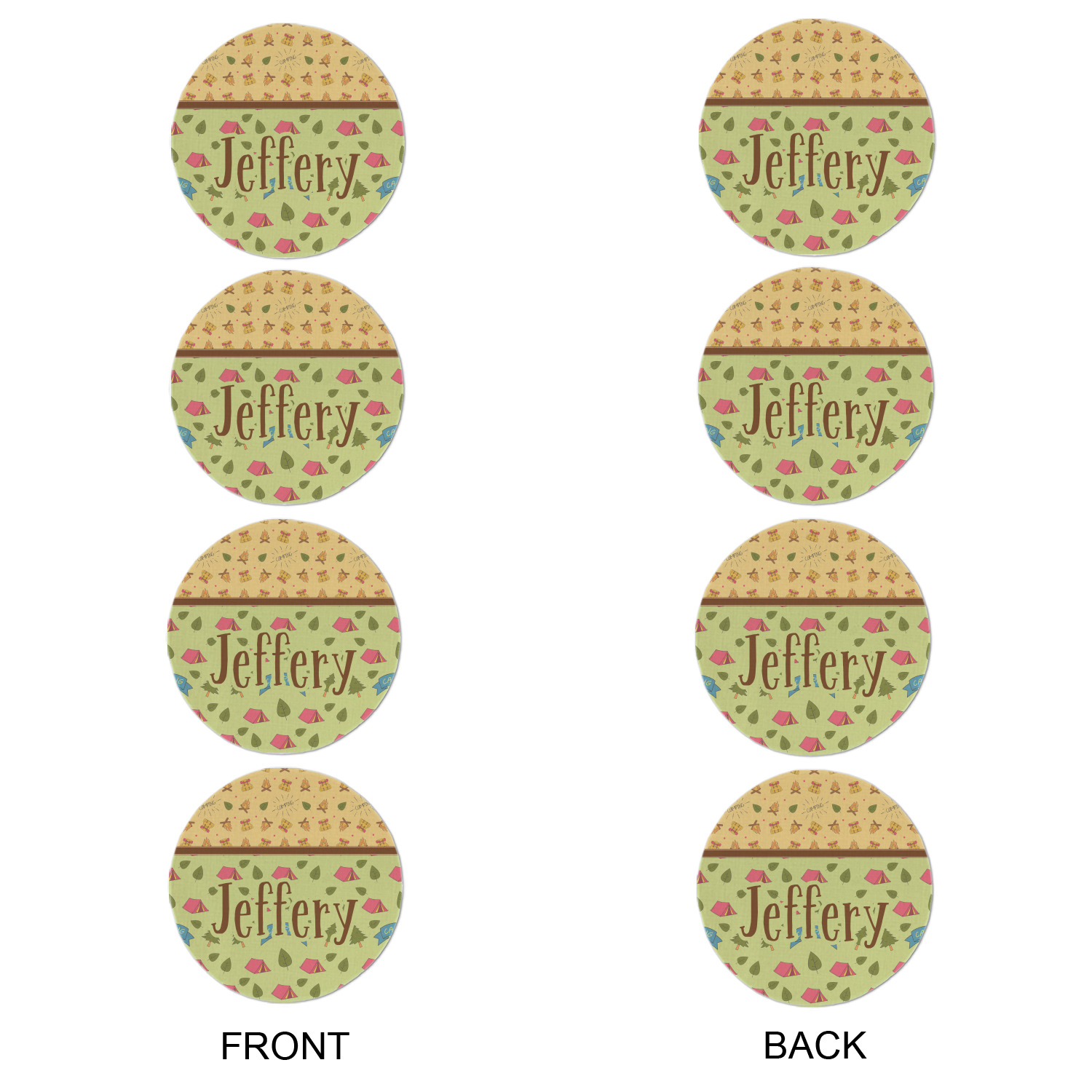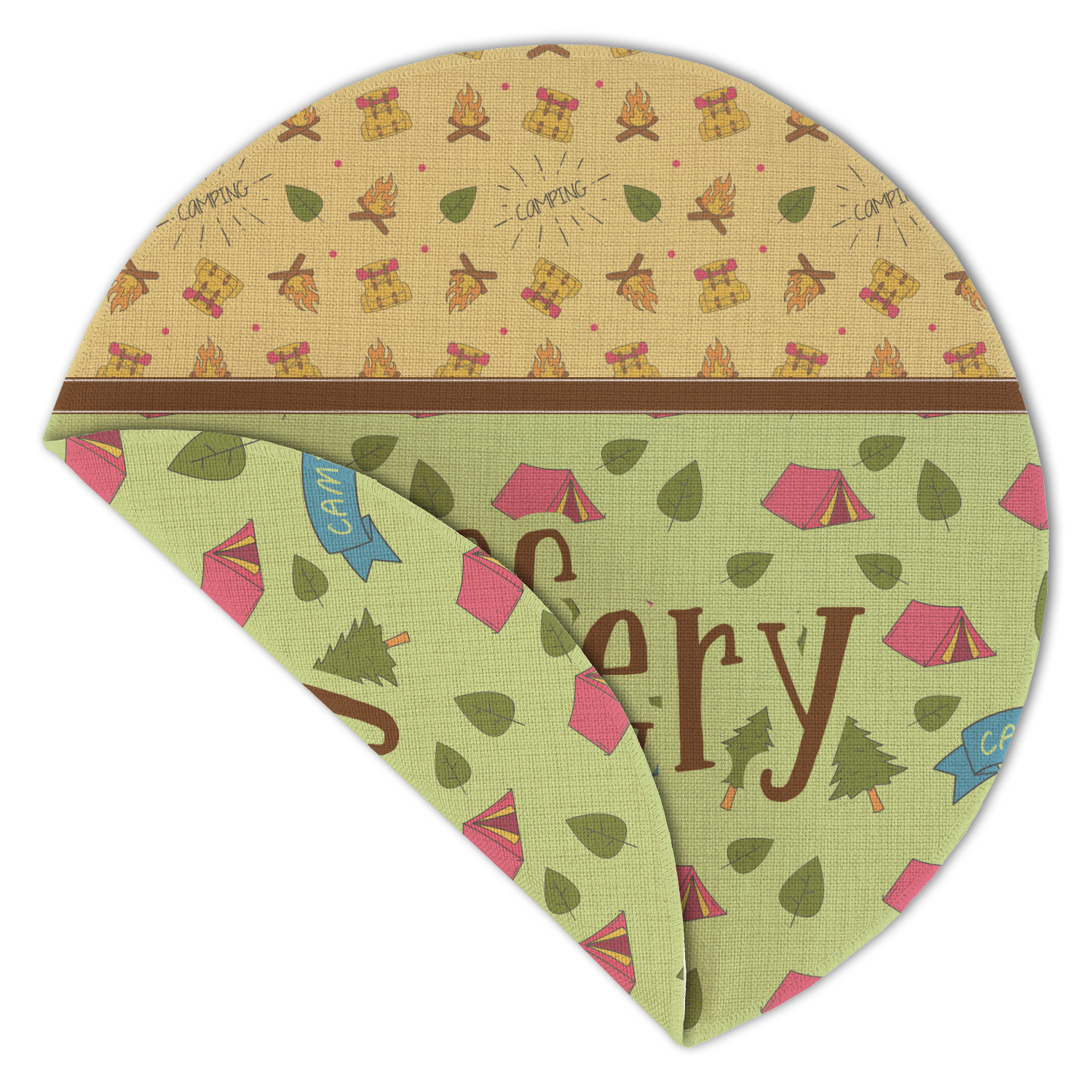 Your name or text fits on the space underneath the brown ribbon, on top of the green pattern. Both patterns have fun graphics that say the word "camping." Easily change the text to a saying or your own name. Take a peek at our camping graphics as well!