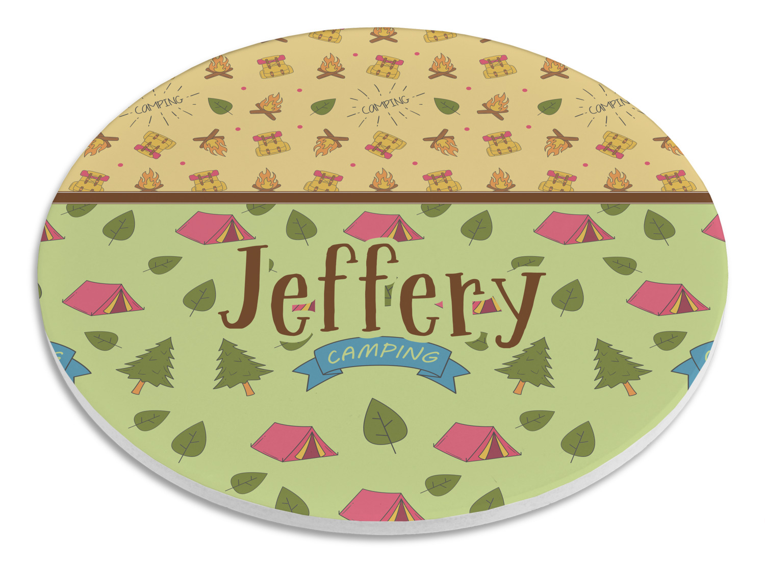 Your name or text fits on the space underneath the brown ribbon, on top of the green pattern. Both patterns have fun graphics that say the word "camping." Easily change the text to a saying or your own name. Take a peek at our camping graphics as well!