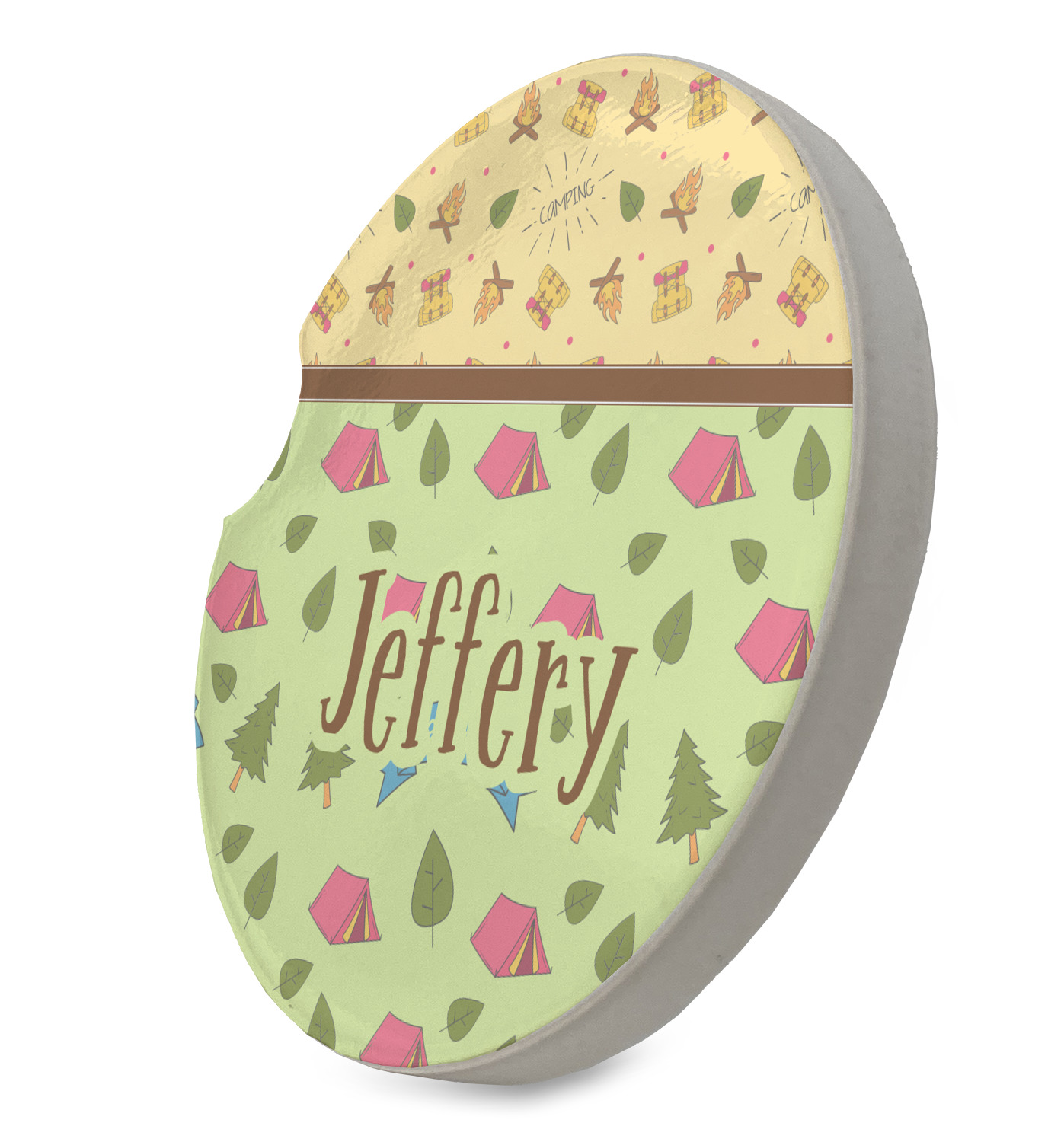 Your name or text fits on the space underneath the brown ribbon, on top of the green pattern. Both patterns have fun graphics that say the word "camping." Easily change the text to a saying or your own name. Take a peek at our camping graphics as well!