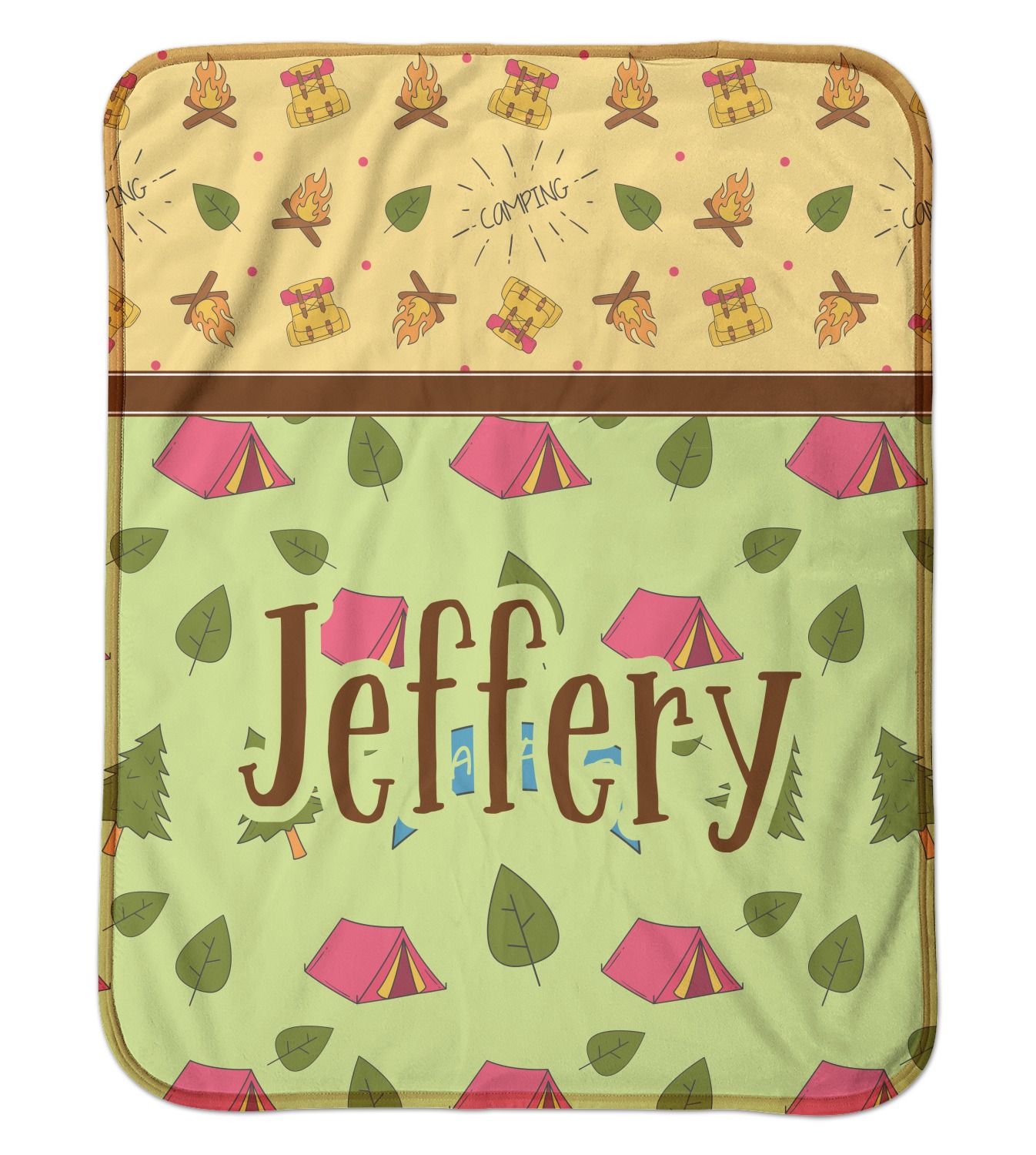 The design is split into two sections with two different patterns. This asymmetrical design has a fun green pattern with red tents and surrounding leaves and trees. This pattern takes up 2/3 of the design. The other 1/3 of the design is filled with a yellow pattern that has campfires and backpacks on it. They are divided by a brown ribbon.