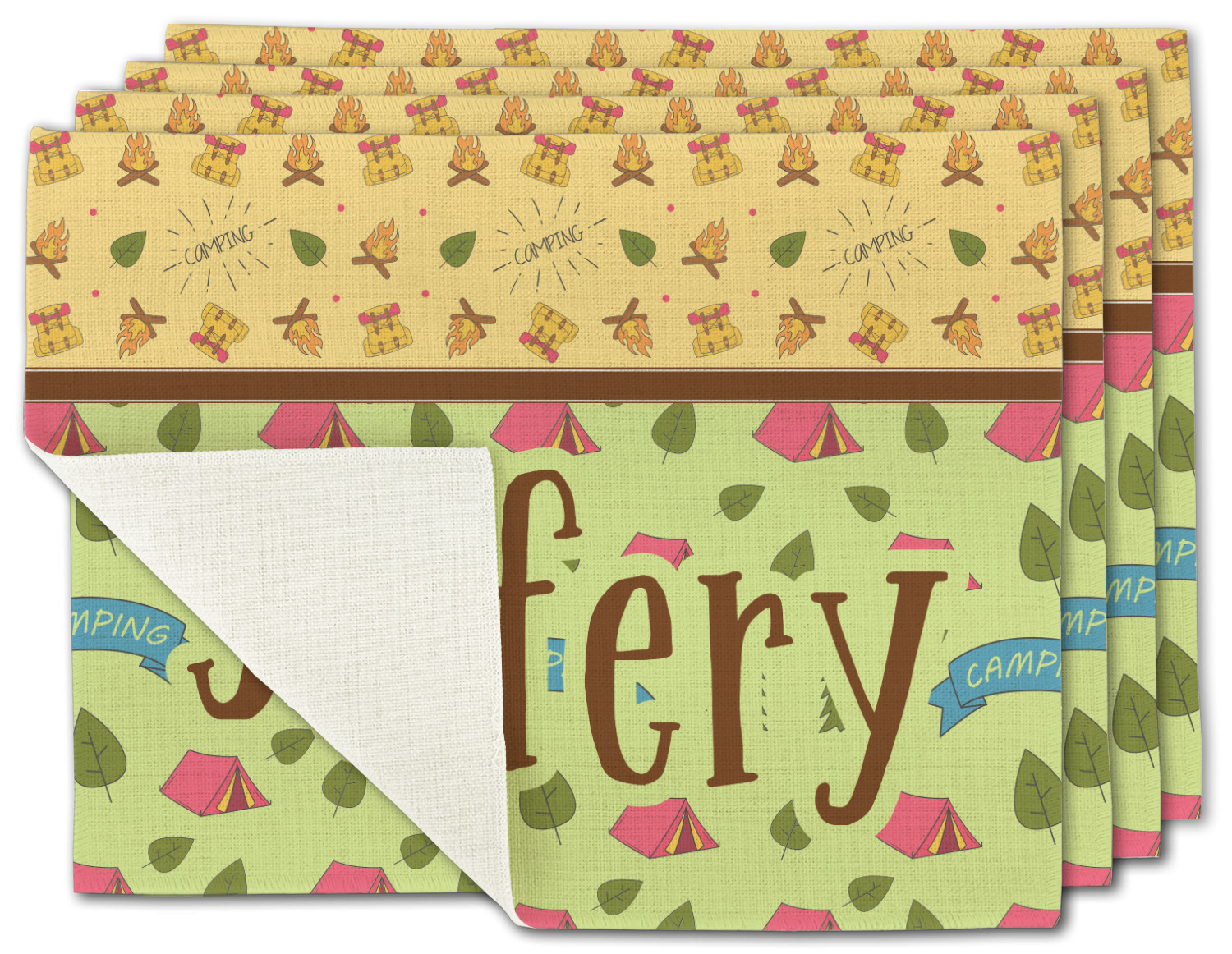 Your name or text fits on the space underneath the brown ribbon, on top of the green pattern. Both patterns have fun graphics that say the word "camping." Easily change the text to a saying or your own name. Take a peek at our camping graphics as well!
