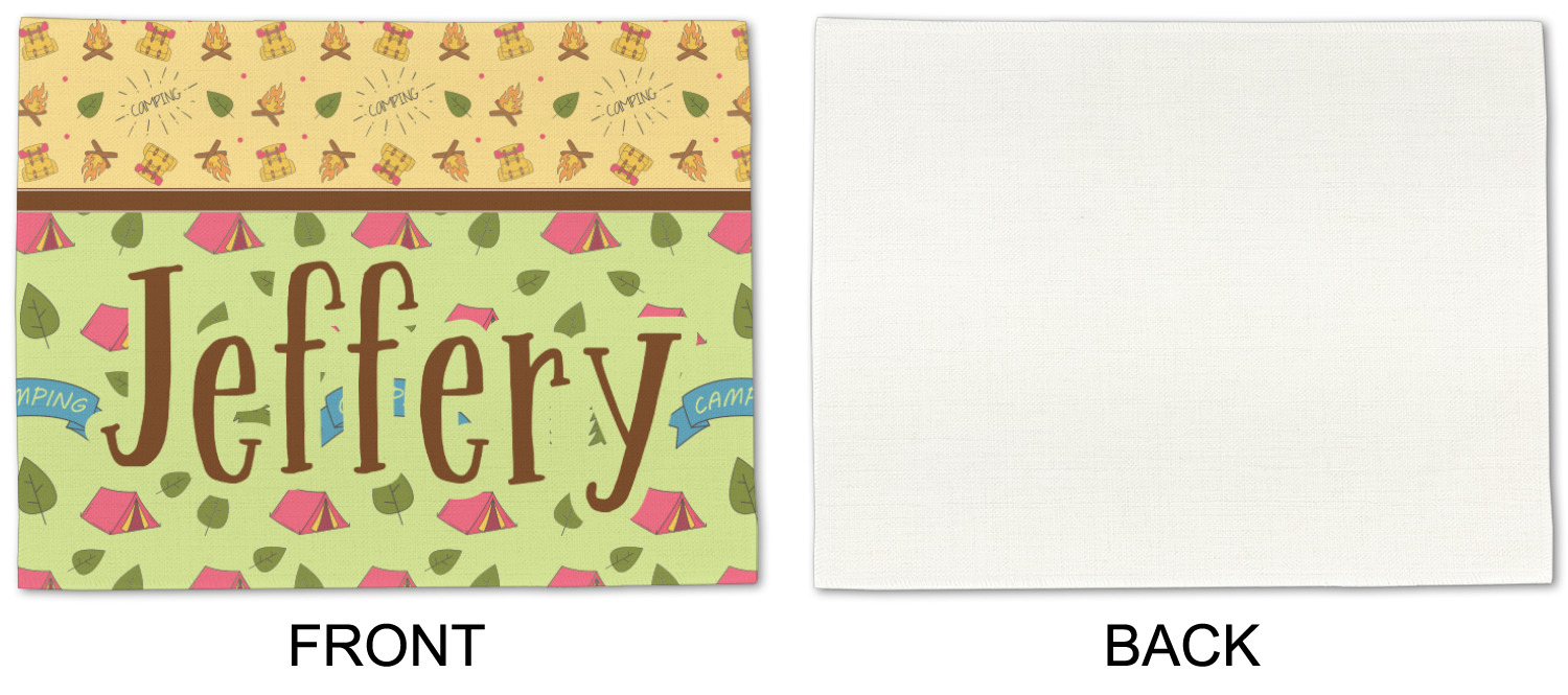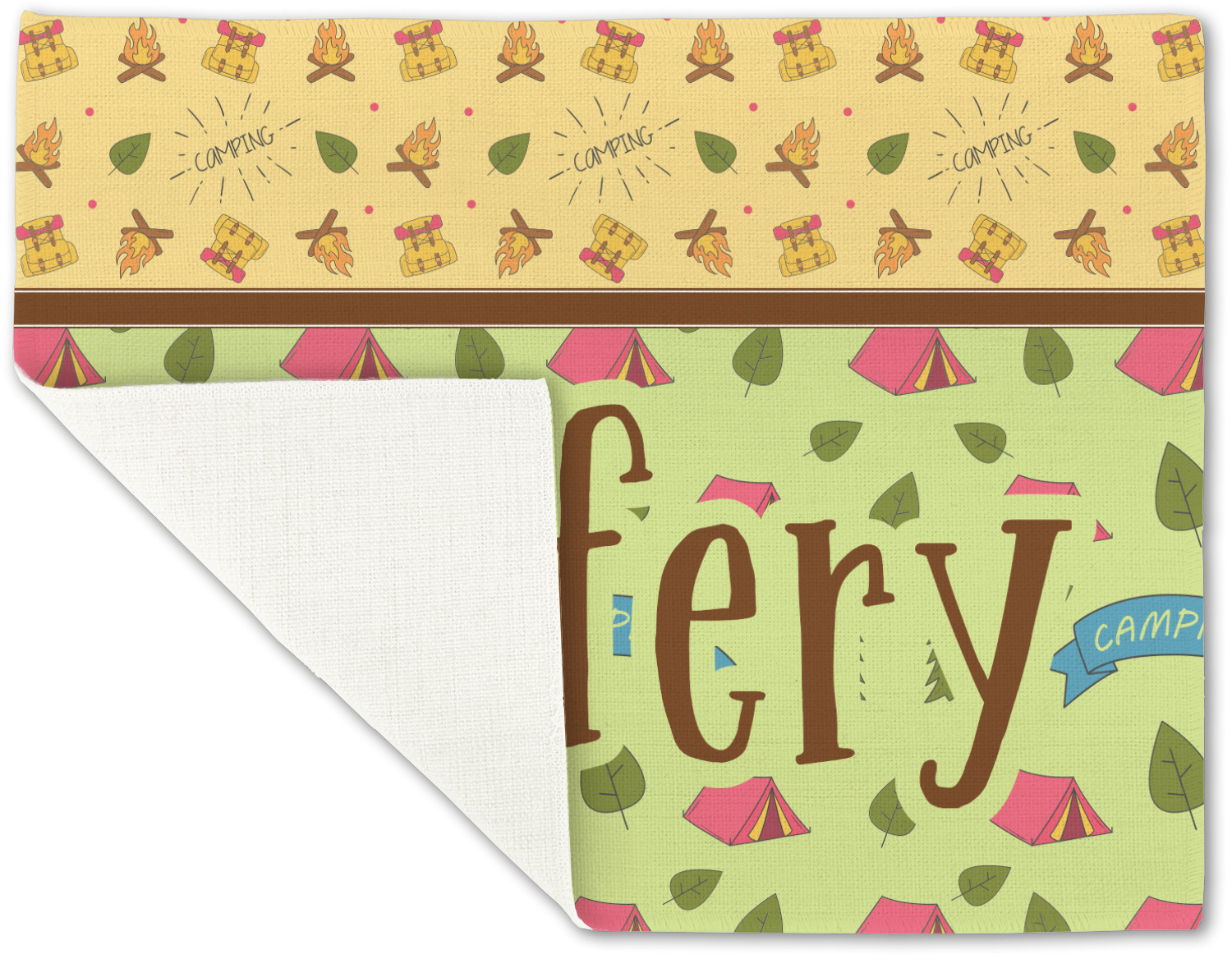 Your name or text fits on the space underneath the brown ribbon, on top of the green pattern. Both patterns have fun graphics that say the word "camping." Easily change the text to a saying or your own name. Take a peek at our camping graphics as well!