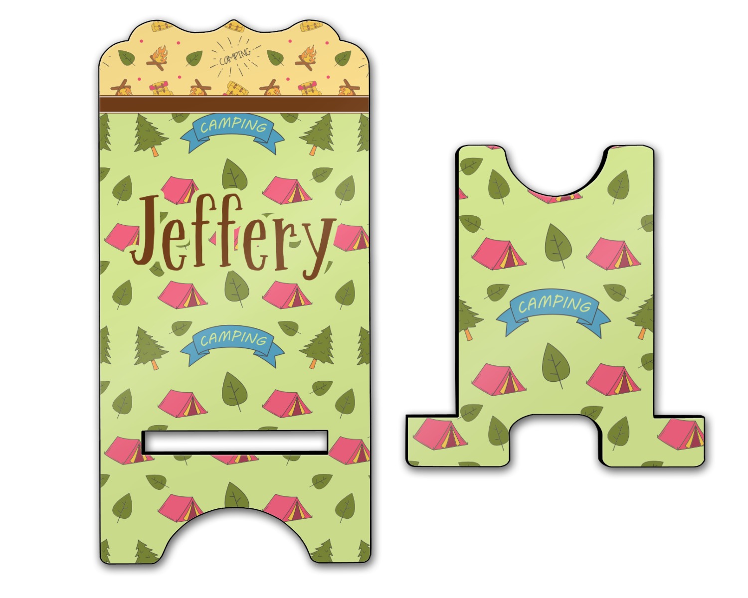 Your name or text fits on the space underneath the brown ribbon, on top of the green pattern. Both patterns have fun graphics that say the word "camping." Easily change the text to a saying or your own name. Take a peek at our camping graphics as well!