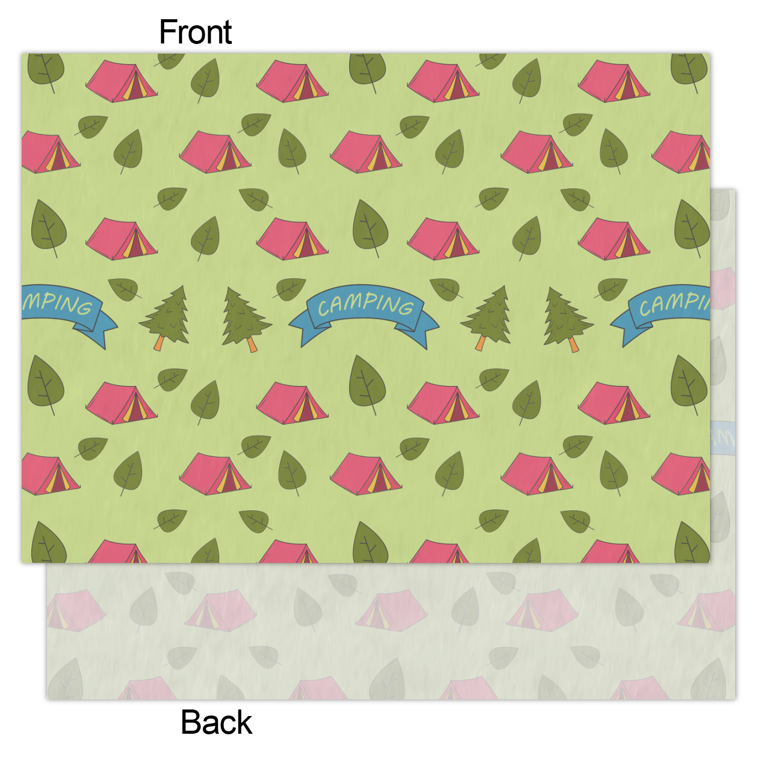 The design is split into two sections with two different patterns. This asymmetrical design has a fun green pattern with red tents and surrounding leaves and trees. This pattern takes up 2/3 of the design. The other 1/3 of the design is filled with a yellow pattern that has campfires and backpacks on it. They are divided by a brown ribbon.