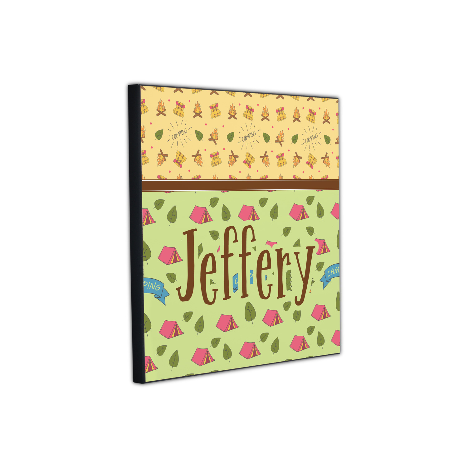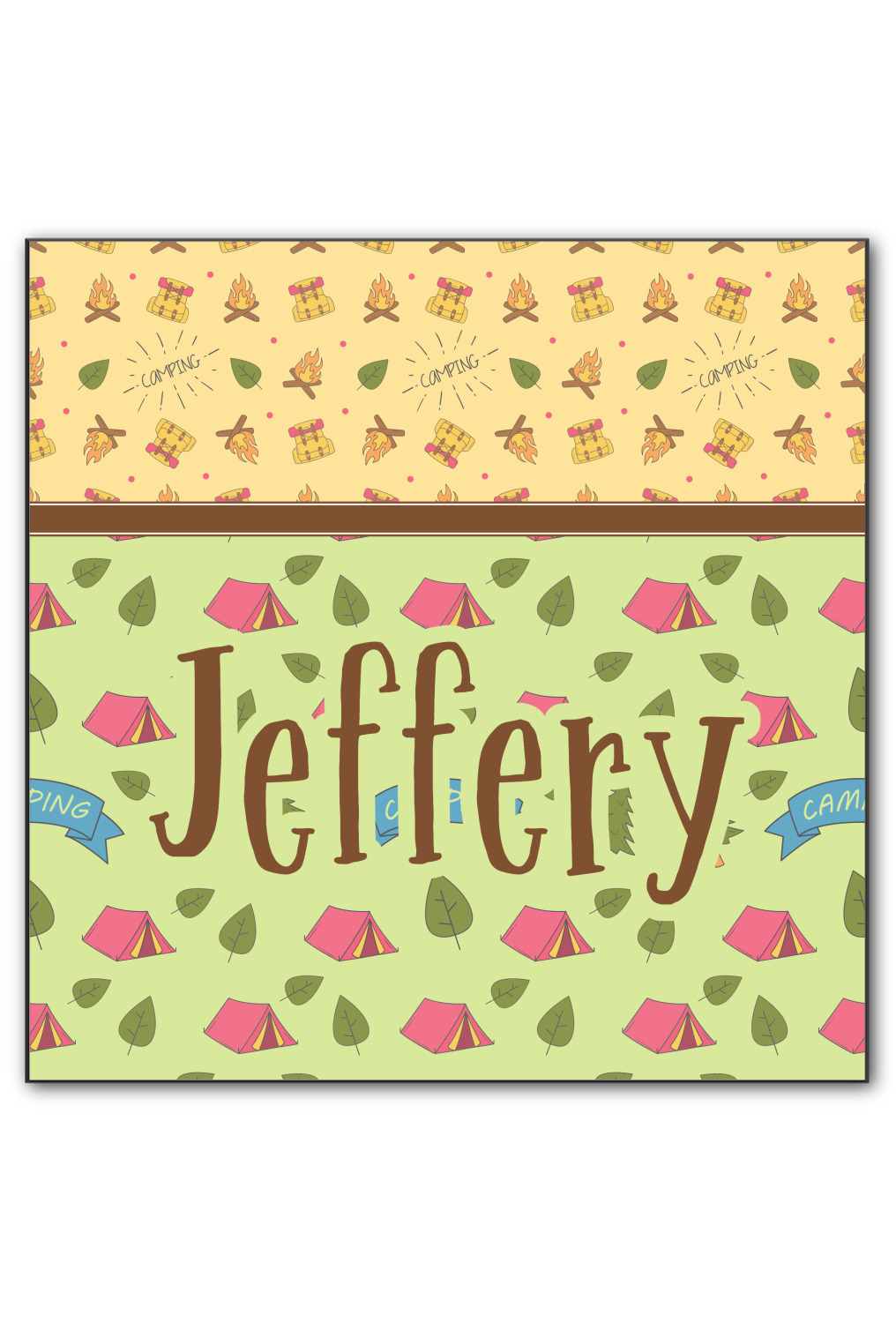 Your name or text fits on the space underneath the brown ribbon, on top of the green pattern. Both patterns have fun graphics that say the word "camping." Easily change the text to a saying or your own name. Take a peek at our camping graphics as well!