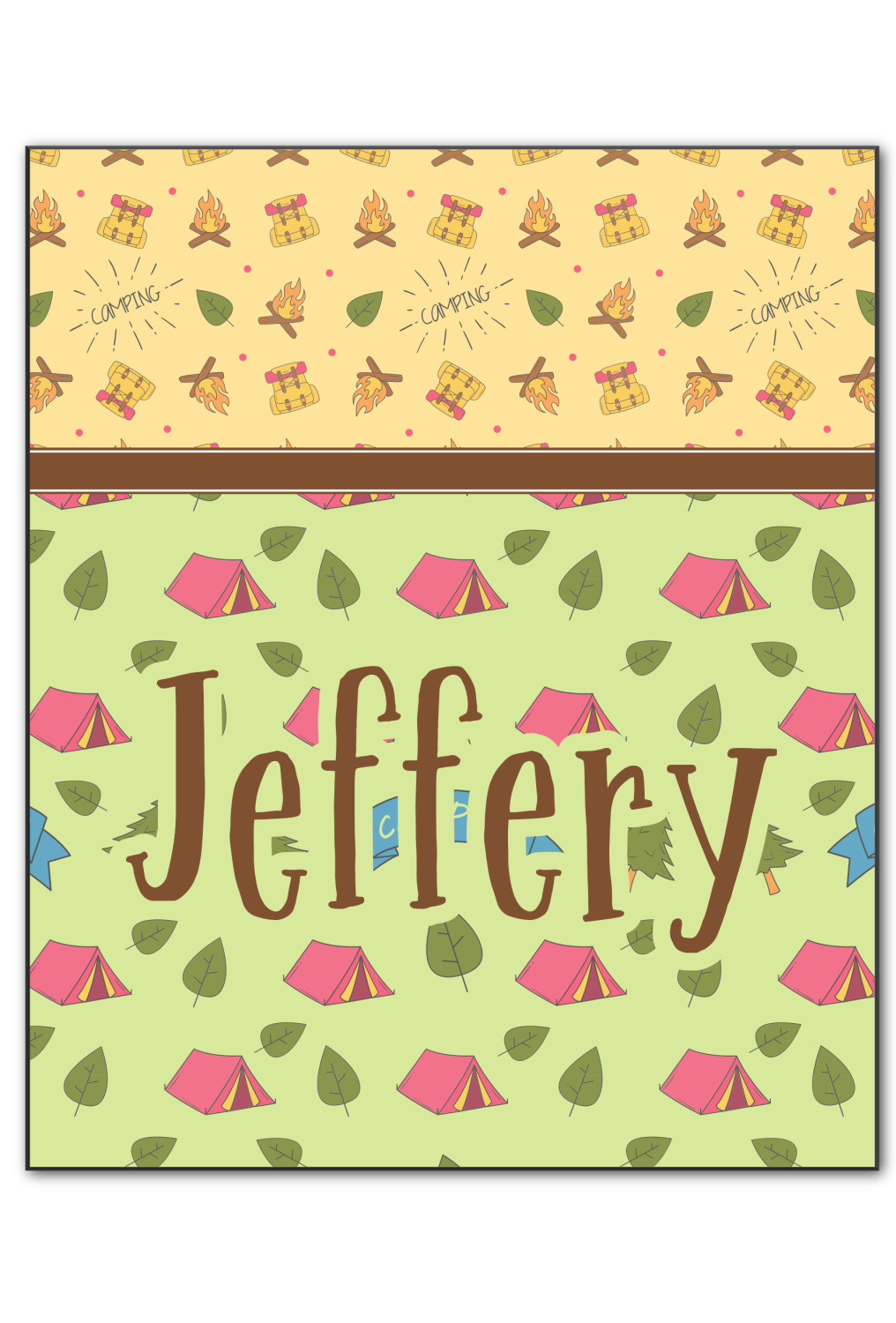 Your name or text fits on the space underneath the brown ribbon, on top of the green pattern. Both patterns have fun graphics that say the word "camping." Easily change the text to a saying or your own name. Take a peek at our camping graphics as well!