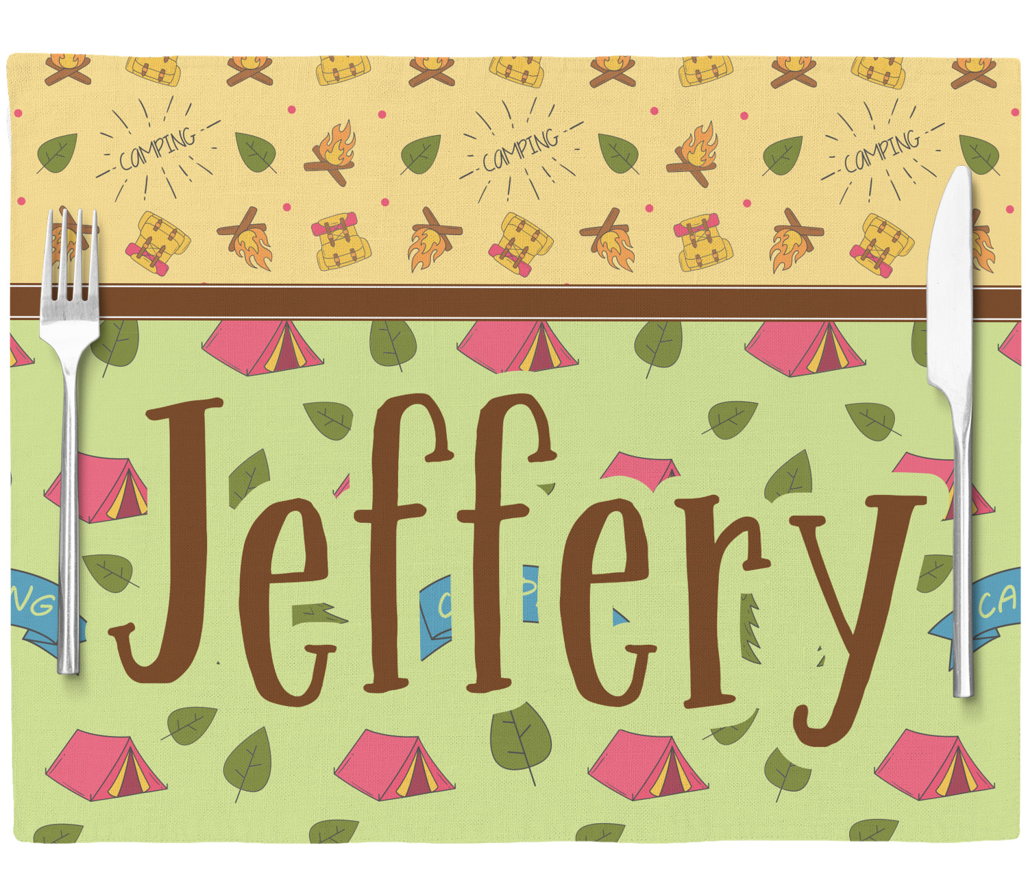 Your name or text fits on the space underneath the brown ribbon, on top of the green pattern. Both patterns have fun graphics that say the word "camping." Easily change the text to a saying or your own name. Take a peek at our camping graphics as well!